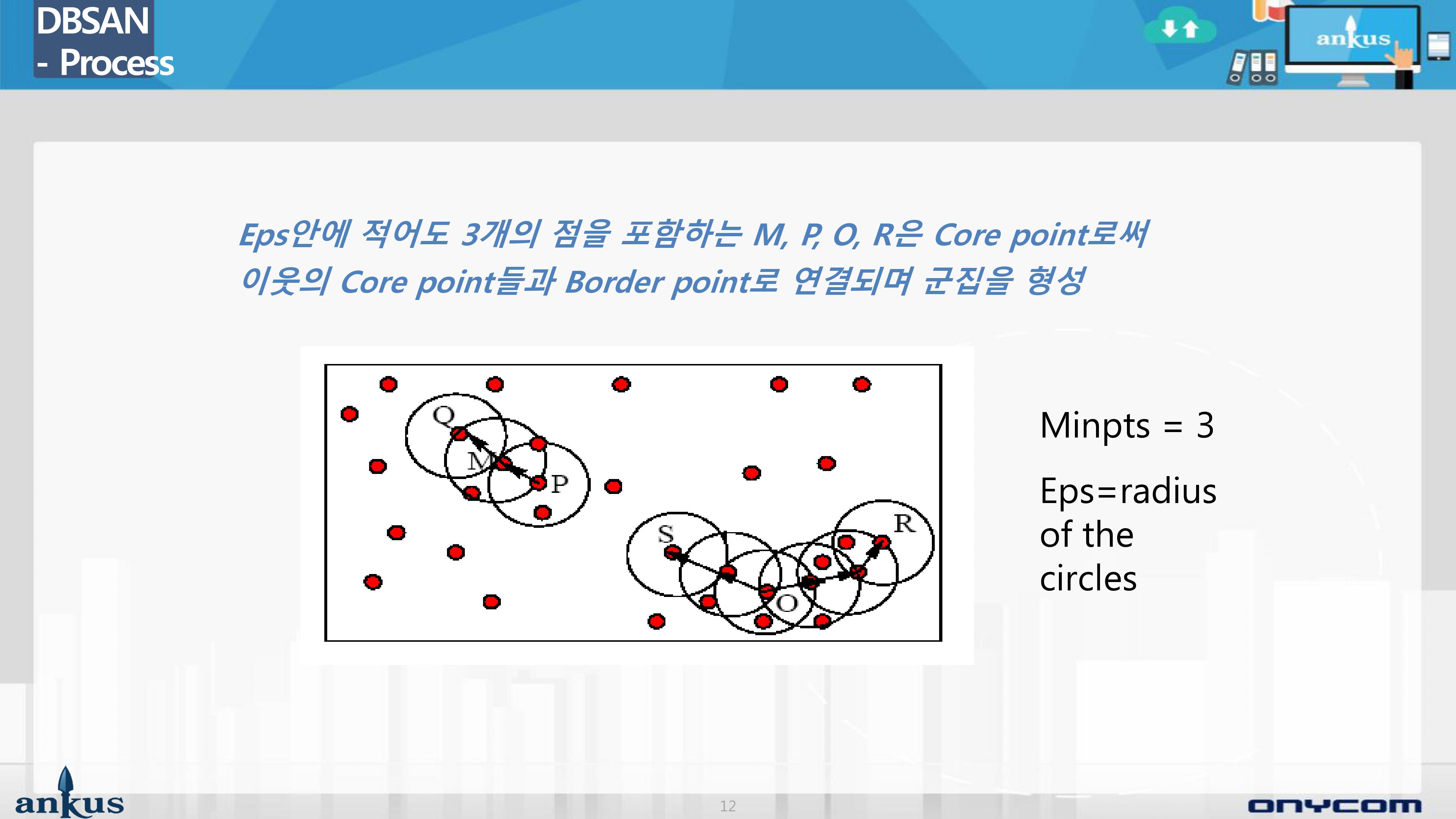 – 만약 점 p 주변 거리 e 안에 Minpts 개 이상의 점이 있다면 p를 core point로 지정 하고 e 내에 있는 점들과 함께 Cluster형성, 이때 e 내에 있는 점들을 neighbors 라고 정의