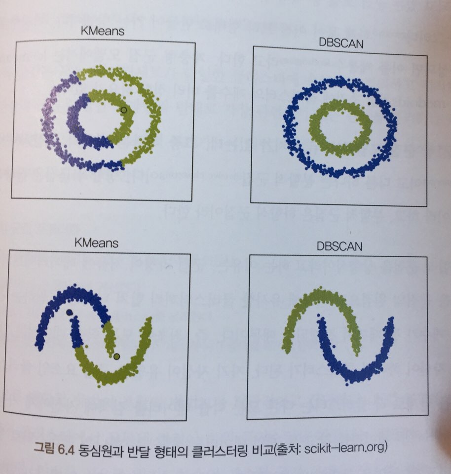 -K-means는 모여있는 데이터 클러스터링 강점. DBSCAN은 오목하거나 동심원 형태의 비선형 데이터 클러스터링 강점