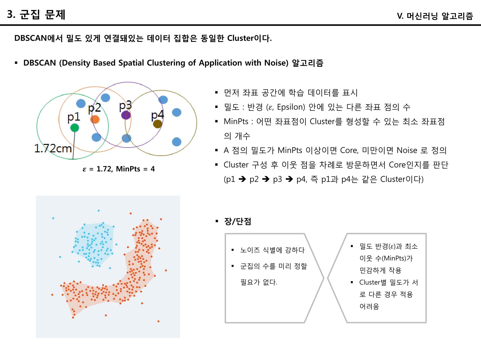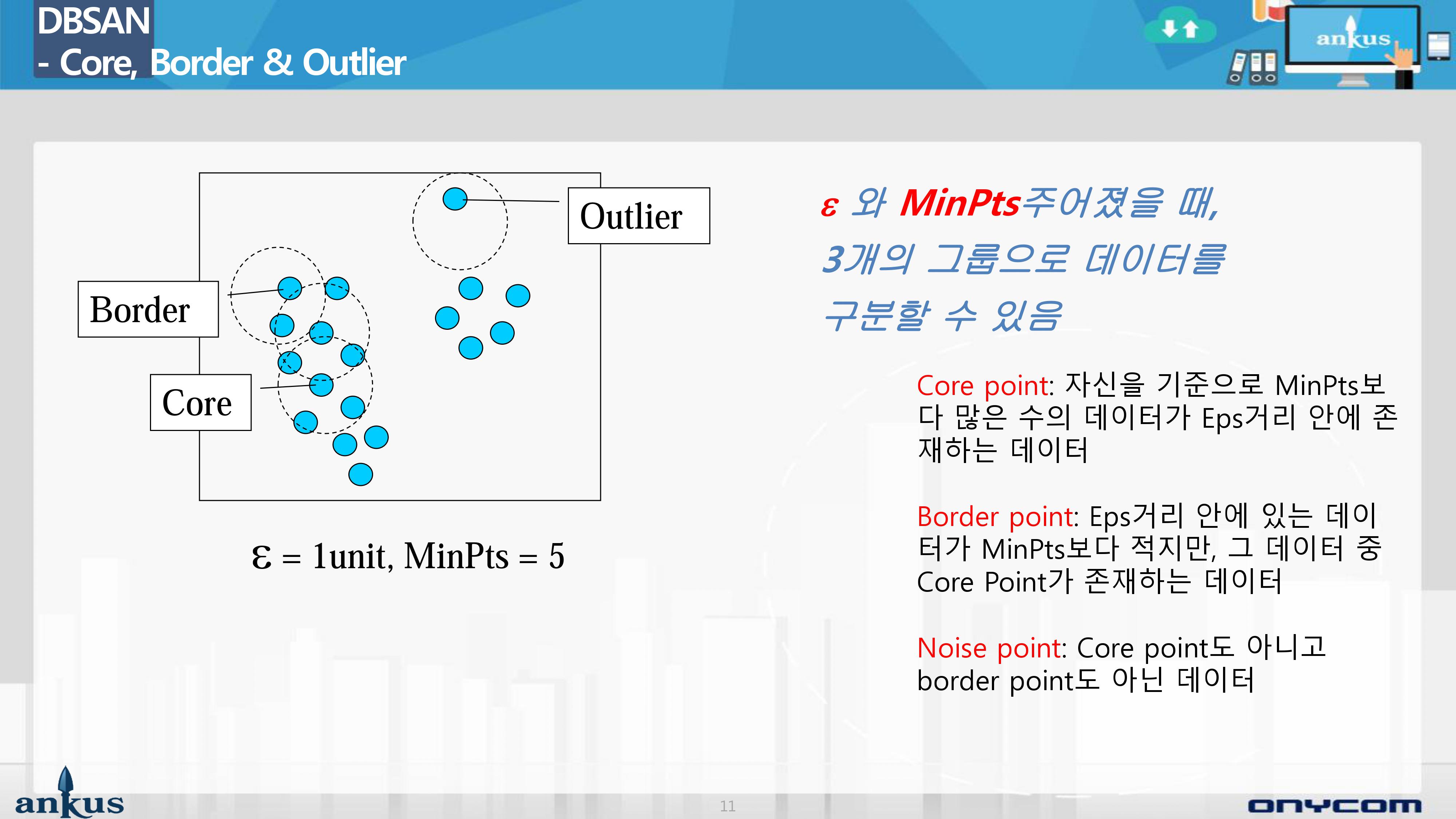 [개념] 주어진 밀도를 이용하여 데이터를 코어, 경계, 노이즈로 구분하여 클러스터링하는 군집 모델링 기법