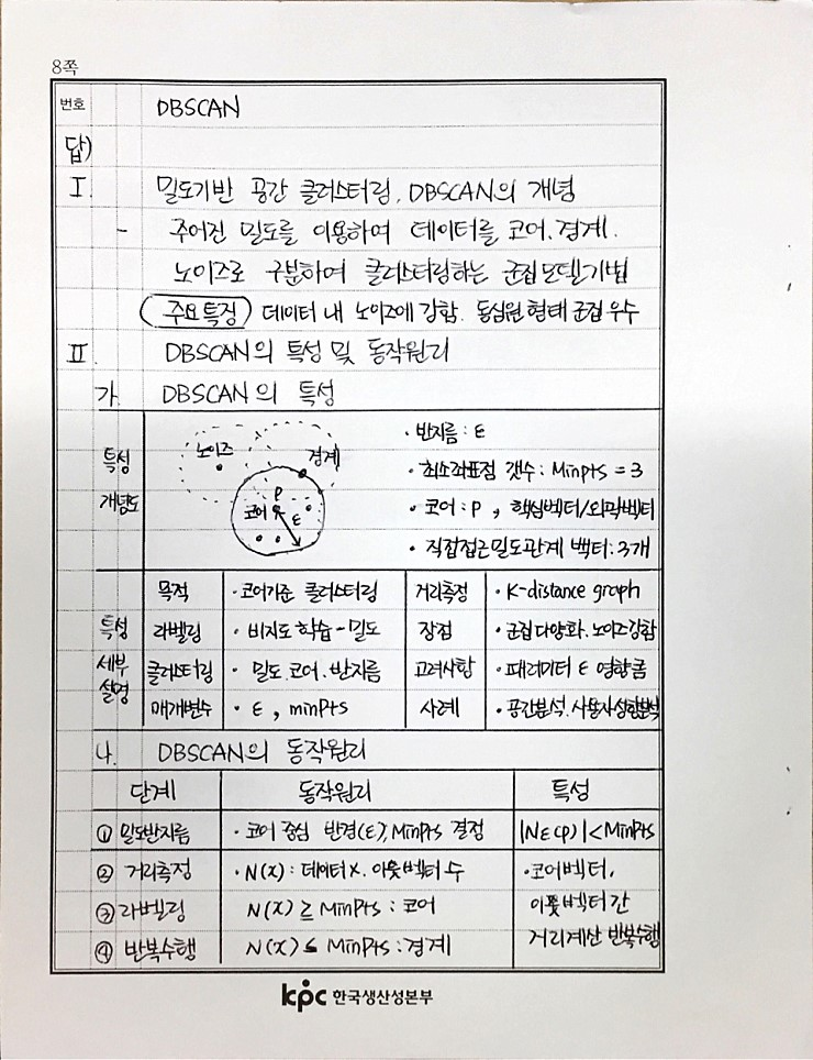 -K-means는 유클리디안 거리 사용, DBSCAN은 임의의 반지름, 밀도, 코어/경계/노이즈 활용