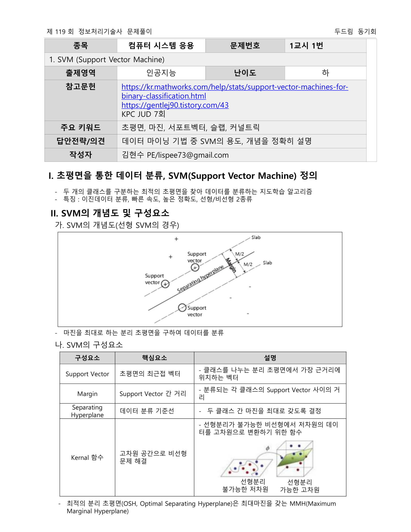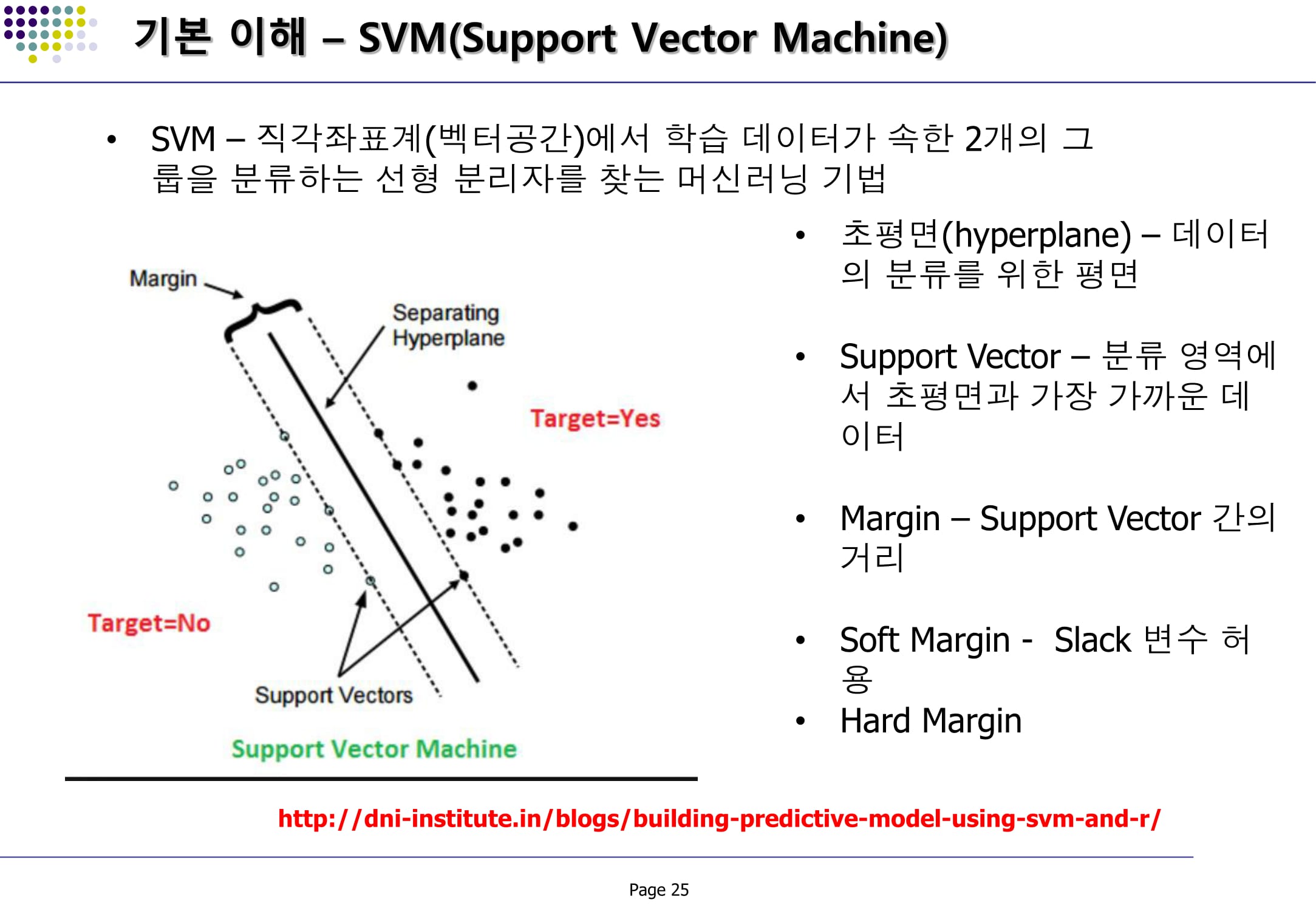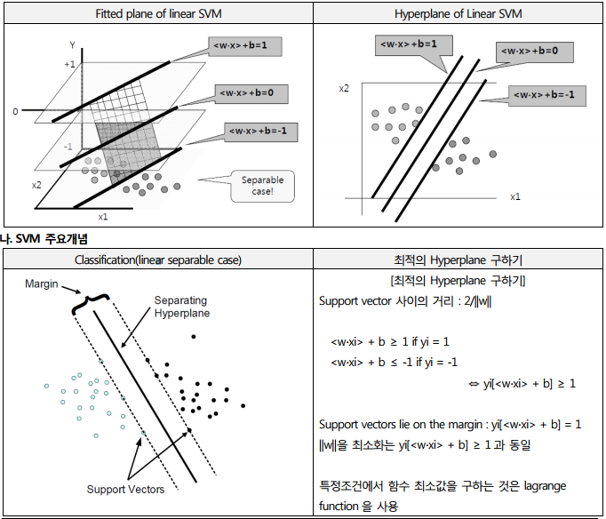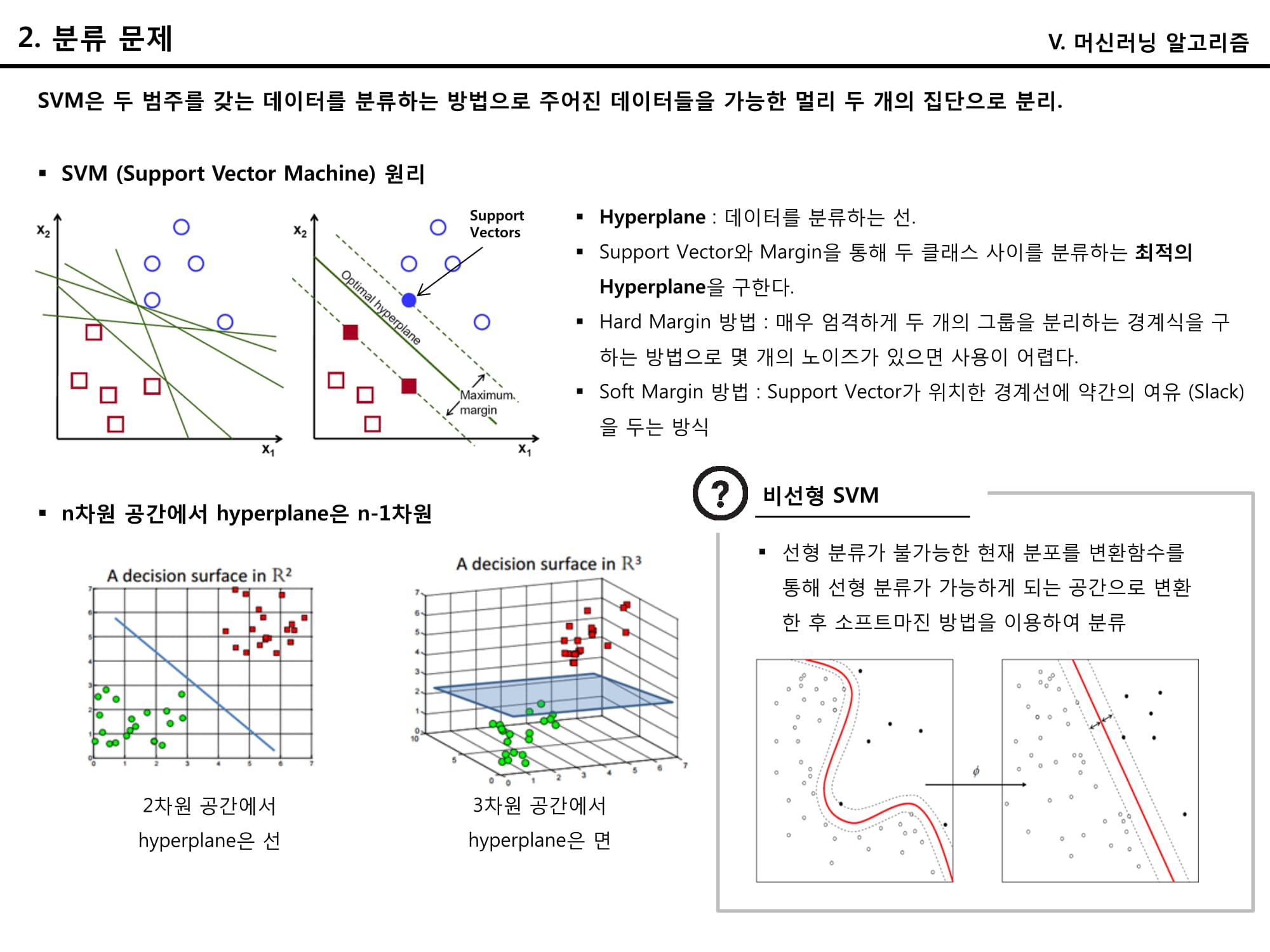 데이터집합을 비확률적 이진선형, 또는 비선형분류를 통해 범주를 나누는 초평면(Hyperplane)을 구하는 지도학습 기반 분류알고리즘. ※이진선형분류:범주를 2개로 분류함을 의미