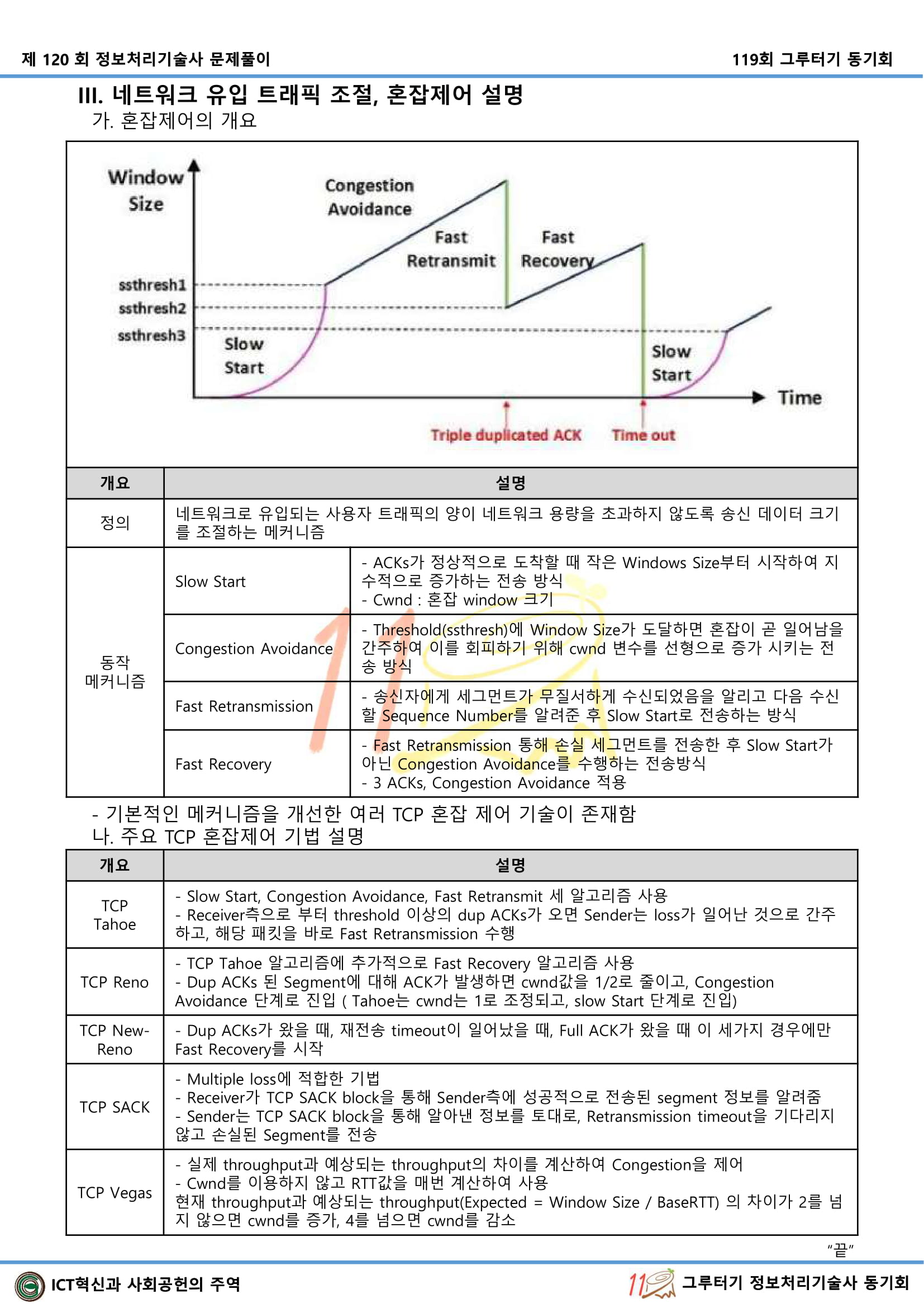 2) 3개 ACK 중복수신: 순차적 재수신 , 윈도우 크기보다 적은 임계치 설정, Fast Retransmit