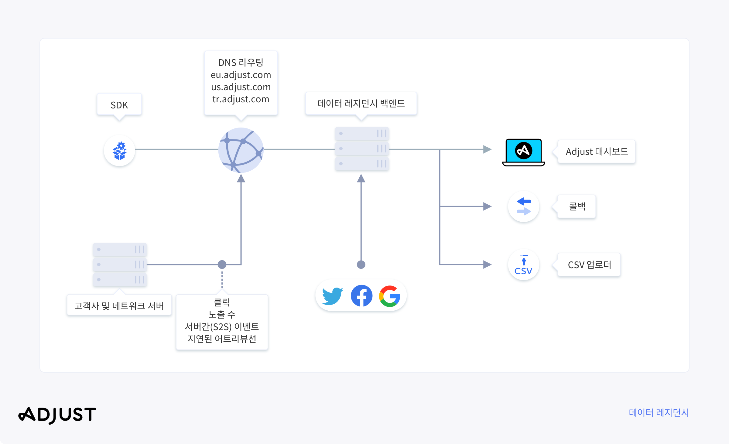 1. 명시적인 데이터 레지던시: 기타 MMP와 달리 Adjust는 암시적인 데이터 레지던시가 아닌 명시적인 데이터 레지던시를 제공합니다. 이는 고객사에 데이터 플로우, 처리, 보관을 포함한 데이터 파이프라인에 대한 통제를 제공합니다. 고객사는 선택한 지역(미국/유럽/터키) 내에 유저 데이터를 보관할 수 있습니다.