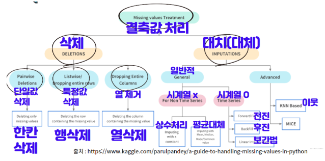 - 결측치는 실험이나 조사시 설문문항 이해의 부족, 부정적 태도, 무관심, 부주의등 이유로 관측되어야 할 값을 얻지 못한 데이터로 전처리 단계에서 적절한 값으로 처리가 필요한 데이터