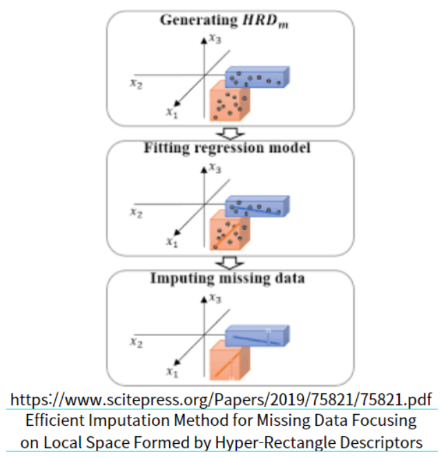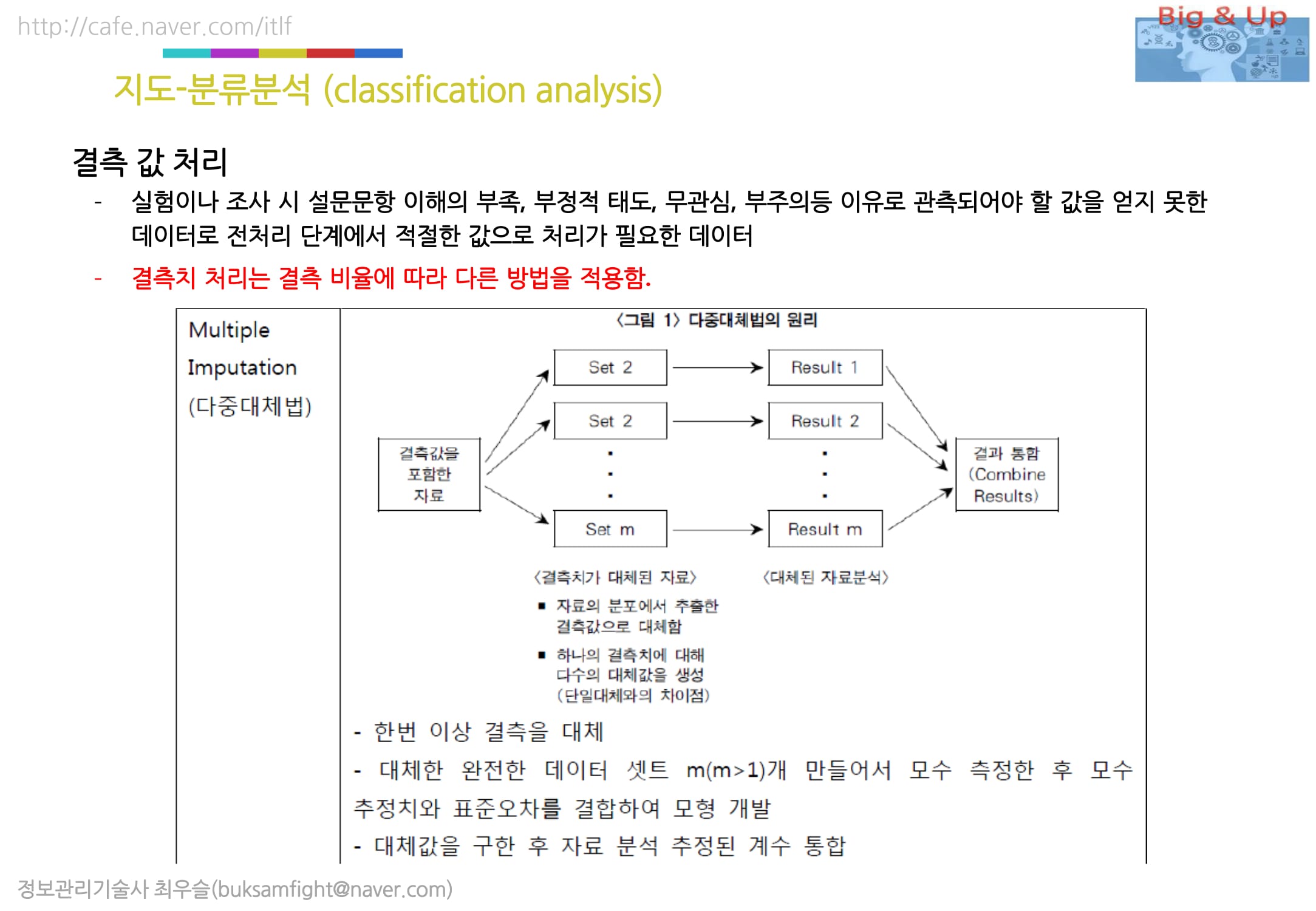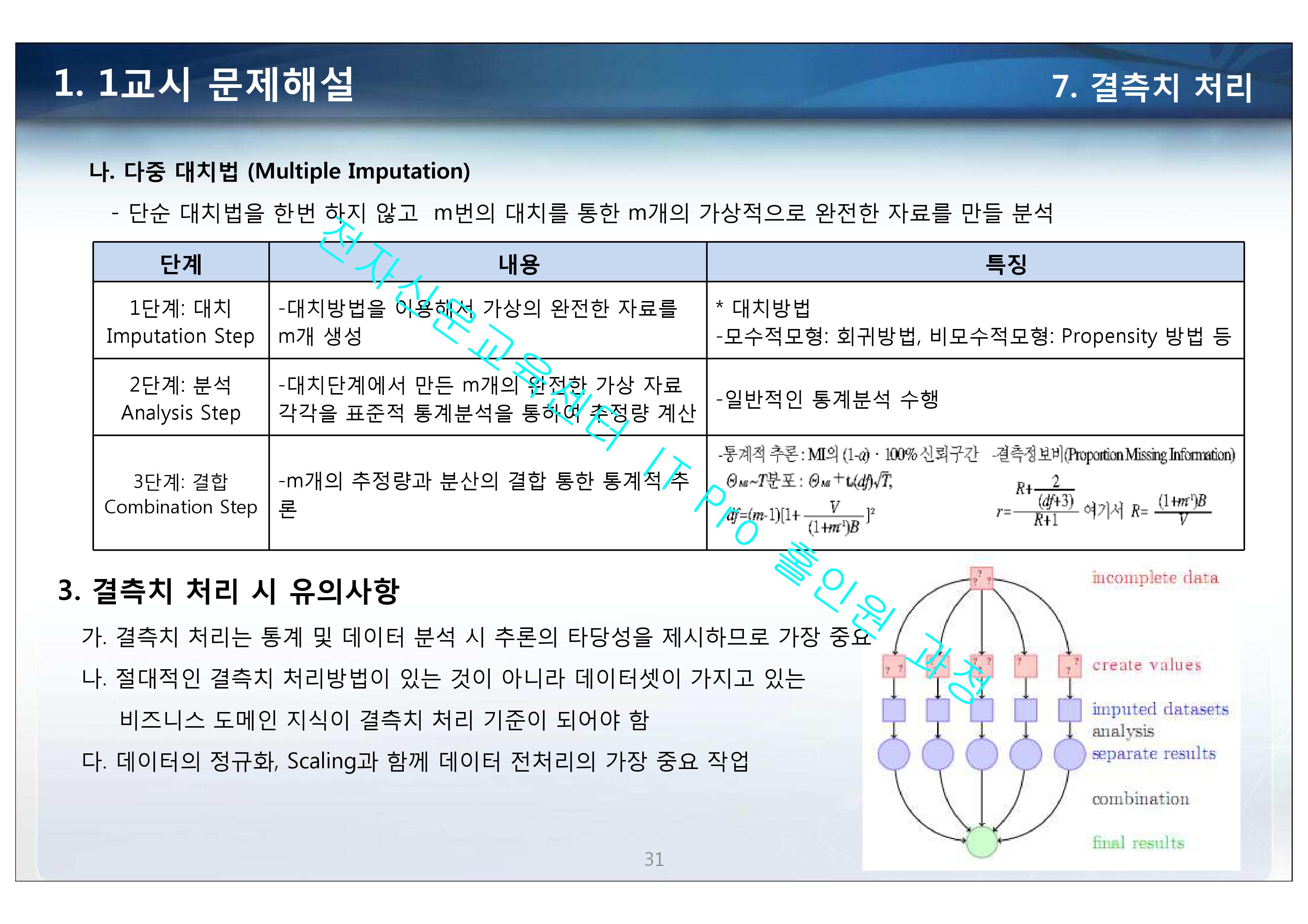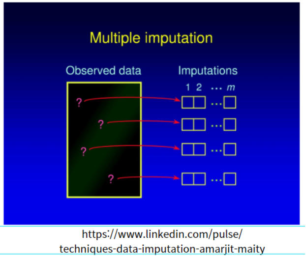 - 대체한 완전한 데이터 셋트 m(m>1)개 만들어서 모수 측정한 후 모수 추정치와 표준오차를 결합하여 모형 개발