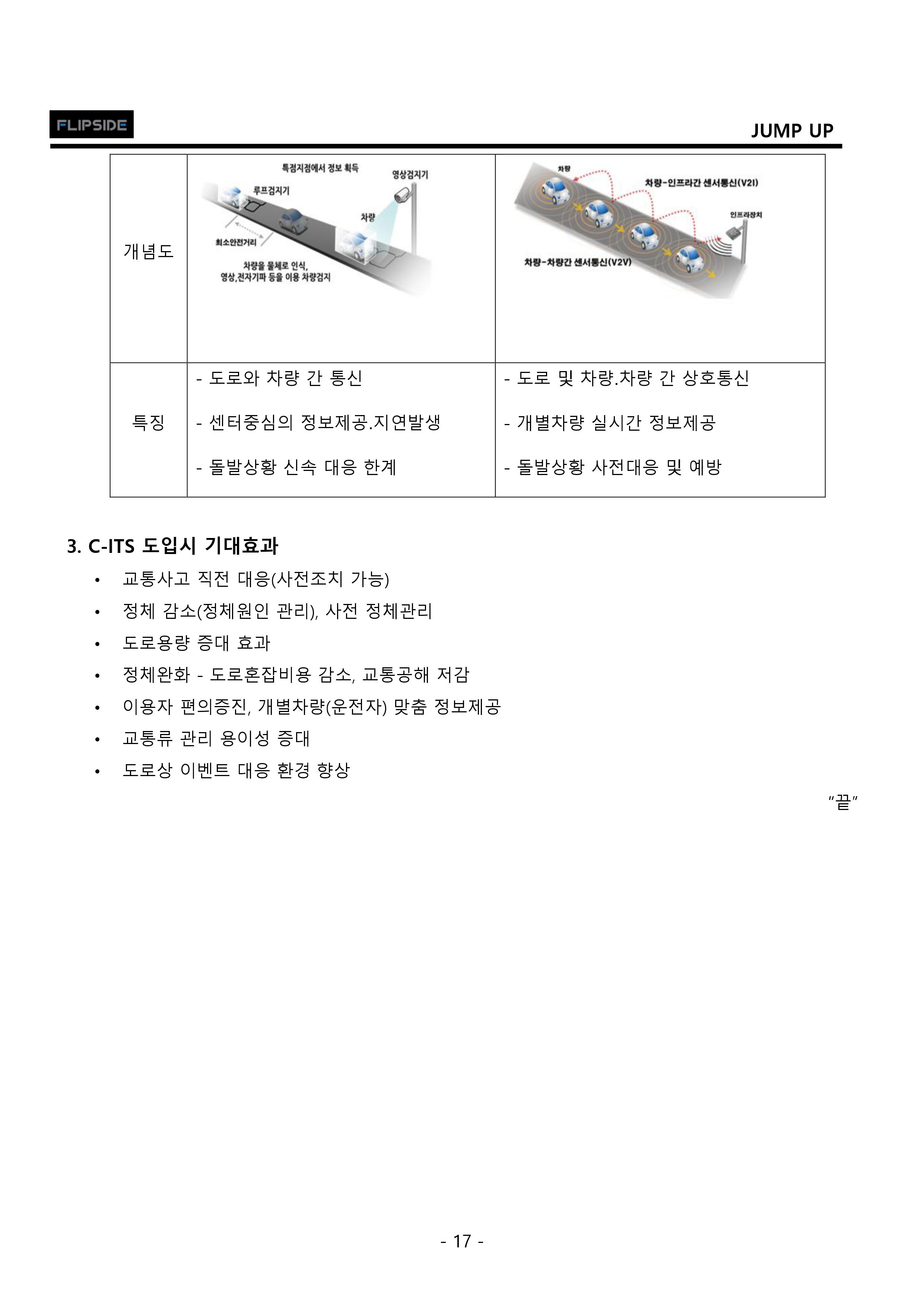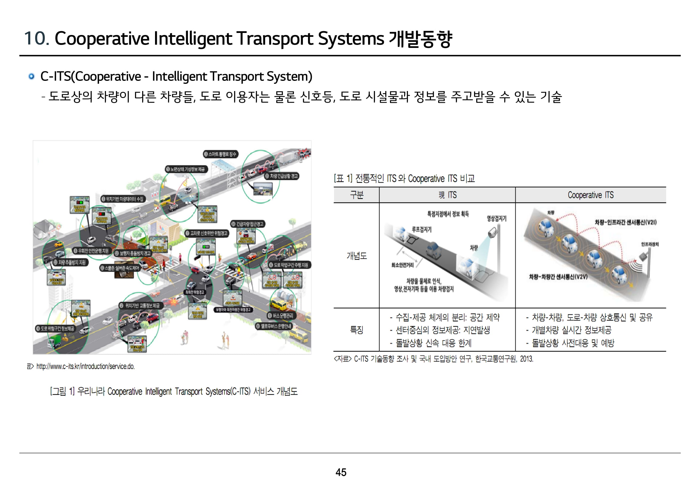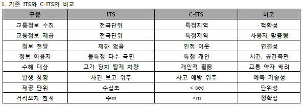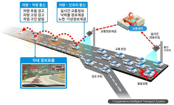 교통정보 수집 제공, 교통류 제어를 위한 도로 인프라 구축 위주의 기존 ITS 사업에서 차량간 정보를 실시간으로 공유하는 C-ITS나 다양한 편의 서비스를 제공하는 스마트카, 각종 센서와 IT를 이용한 자율주행차를 지원하는 사업 등으로 점차 변화되는 추세입니다.