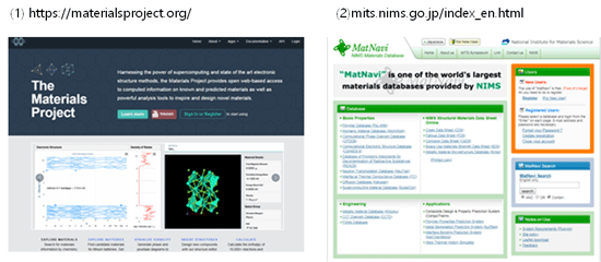[그림 2] 세계적인 소재 관련 데이터 베이스 소개 (1) MaterialsProject, (2) MatNavi