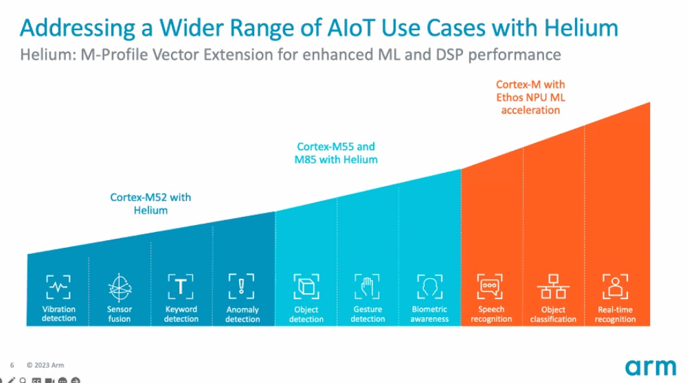 (Coverage) 가벼운 머신 러닝 처리(M52)부터 사물 인식과 제스처 인식 등이 가능한 ML 제품 M85와 M55, 음성인식과 실시간 인식 등이 가능한 고급 제품군인 Cortex-M 전용 NPU(Arm Ethos-U55)를 통해 엣지 디바이스에서의 머신러닝 라인업 전체를 지원