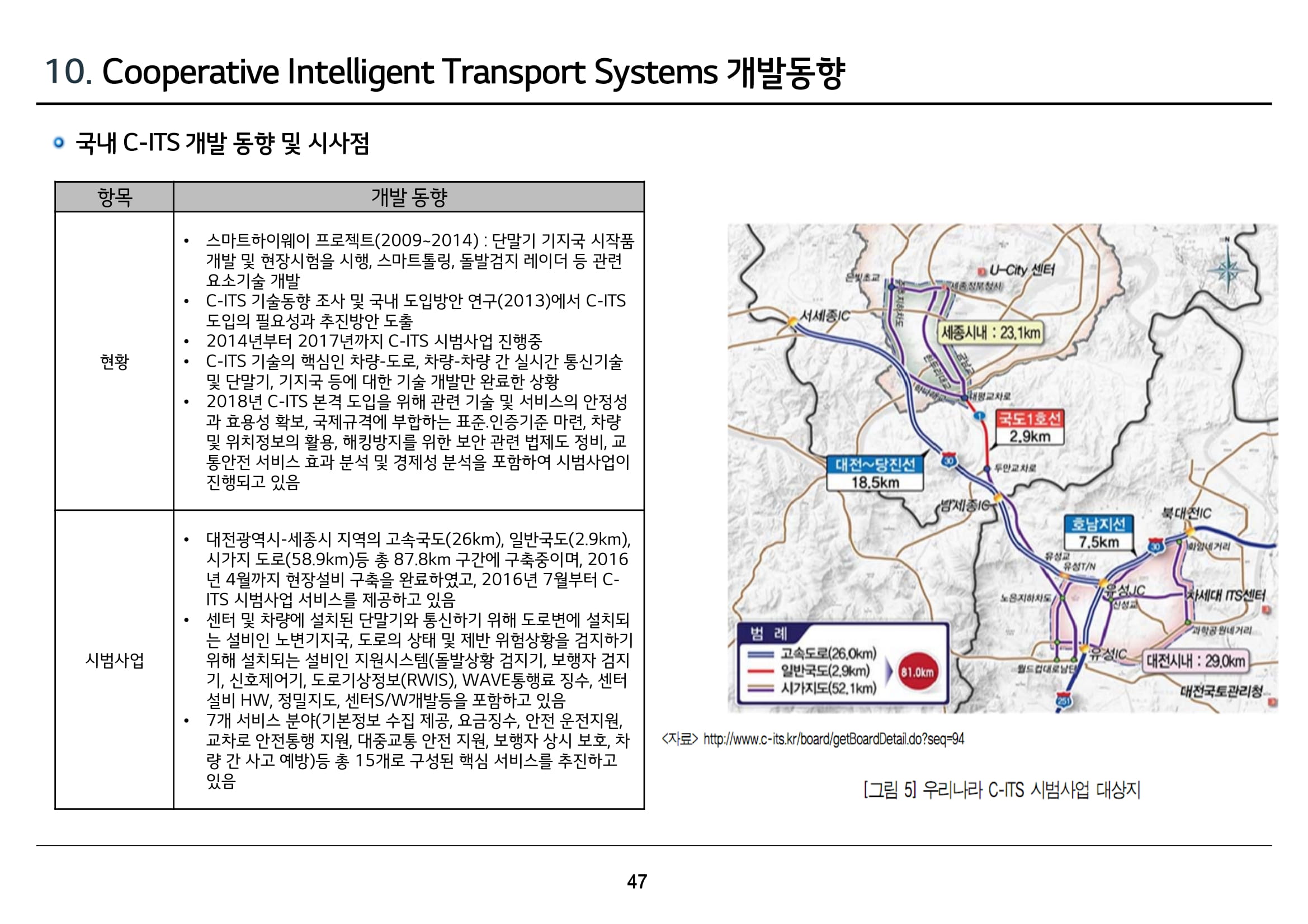 - 근거리전용통신(DSRC)의 일종인 웨이브(WAVE) 방식으로 고속도로에 C-ITS 구축을 시작