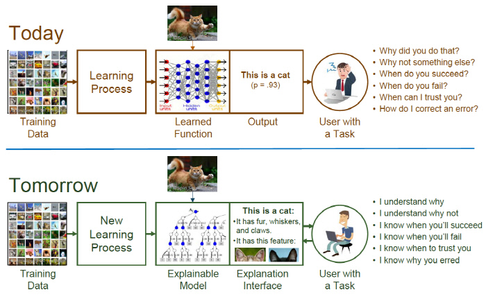 설명가능 인공지능은 딥러닝이 어떤 사물을 고양이로 인식했을 때 또 다른 인공지능 툴로 무엇을 언제 고양이라고 했고 언제 아니라고 했는지 모니터링하고 분석하는 것이다. 기존 딥러닝 과정에 설명가능 툴을 붙여 사진에서 어떤 특징들을 고양이로 판단하는데 활용했는지 밝히는 것이다. 이를 응용하면 암세포나 질병 진단, 전장에서 적군을 판단하는 데도 적용할 수 있다. 출처:DARPA