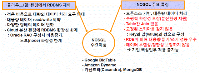 ※ 네트워크 발전으로 인해 많은 양의 데이터가 생겨나고 이를 처리하기 위해 클라우드 컴퓨팅 등 분산 처리 시스템이 도입되면서 기존의 RDBMS는 이를 위한 확장성을 지원하는 못하는 한계