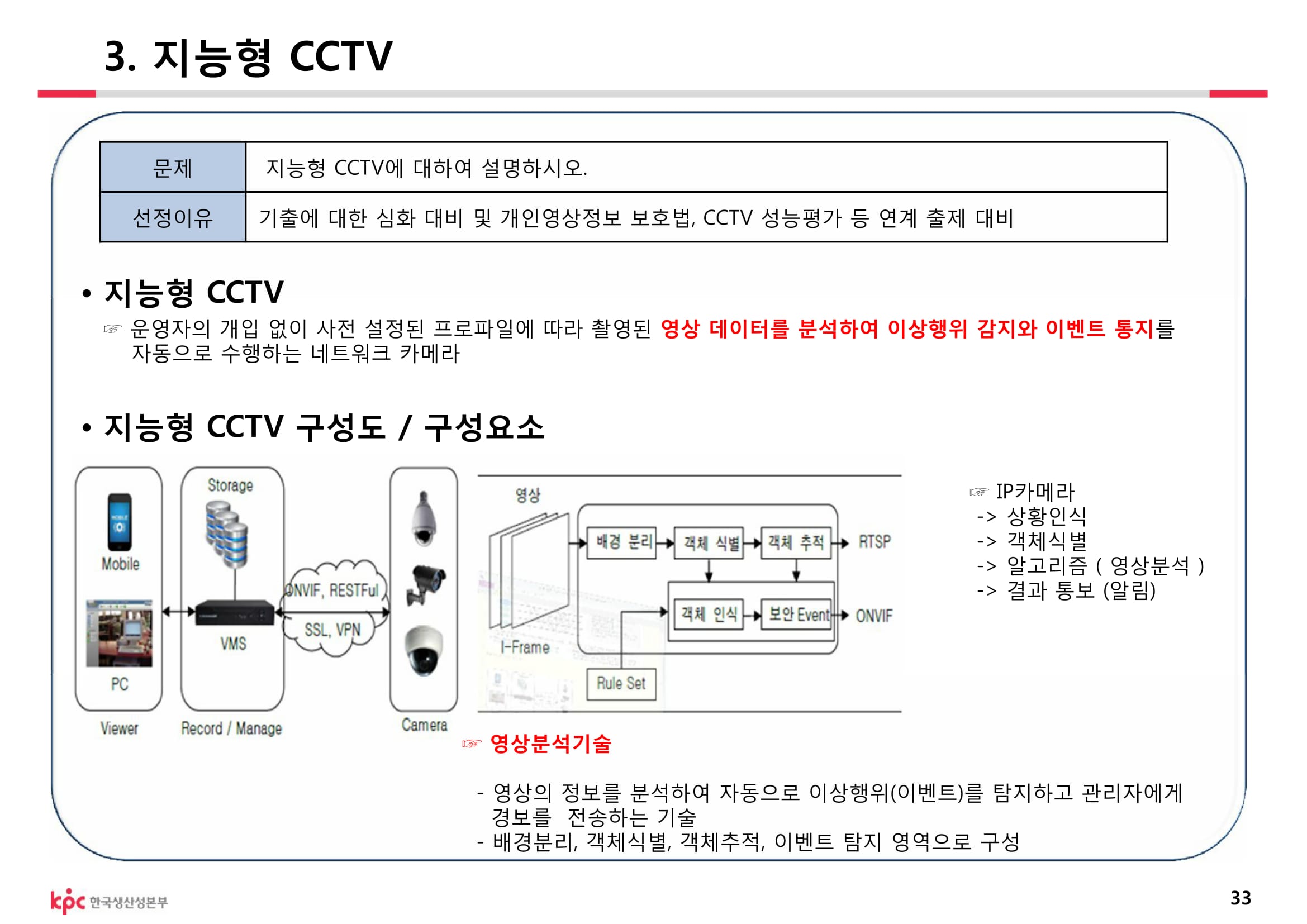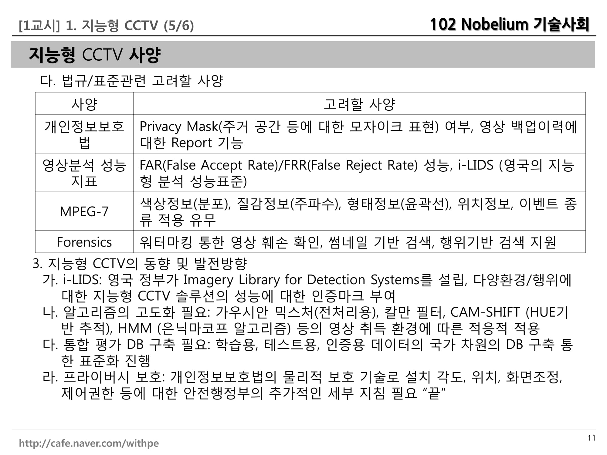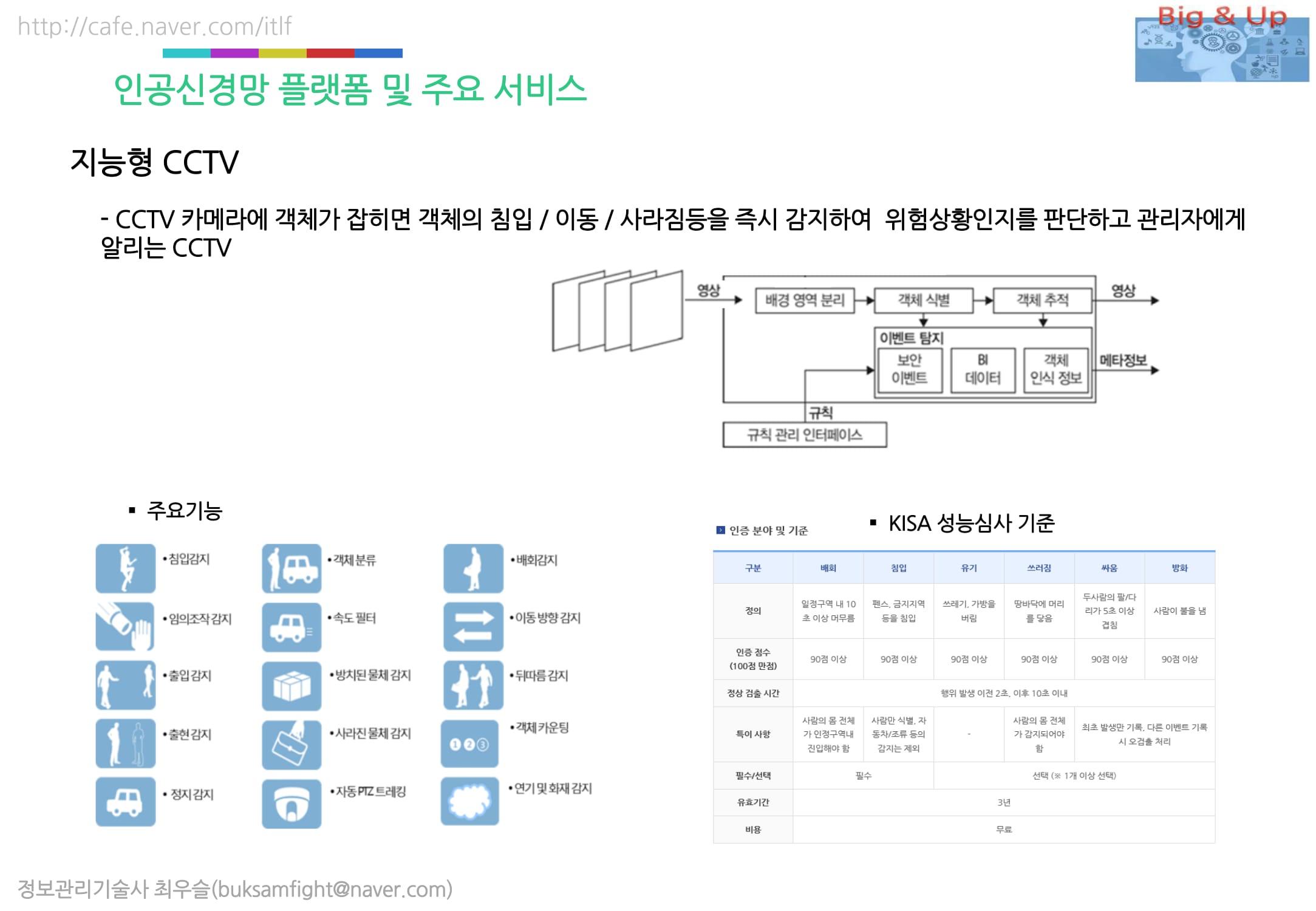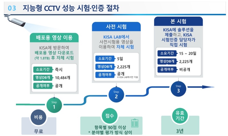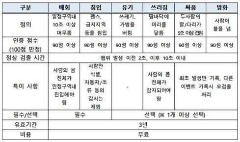 ※ 한국인터넷진흥원(KISA), '지능형 CCTV 솔루션 인증서' 발급 : 얼마나 특정 행위(배회, 침입, 유기, 쓰러짐, 싸움, 방화)를 잘 검출하는지 평가. 유효기간 3년