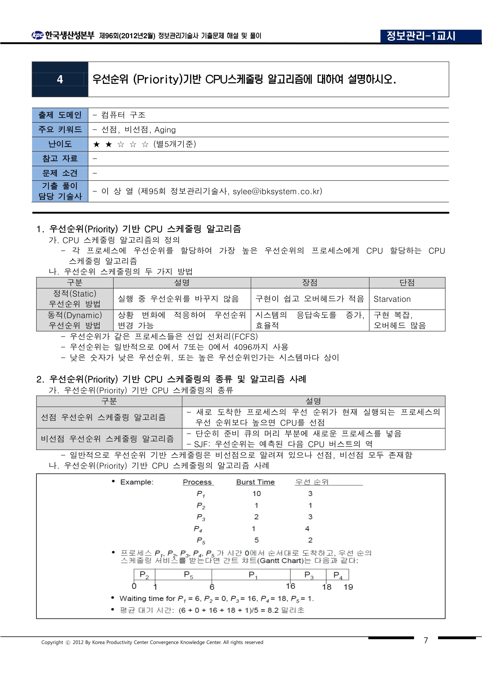 ‧ 단점 : 우선순위 낮은 프로세스는 기아 현상 발생 가능합니다.
