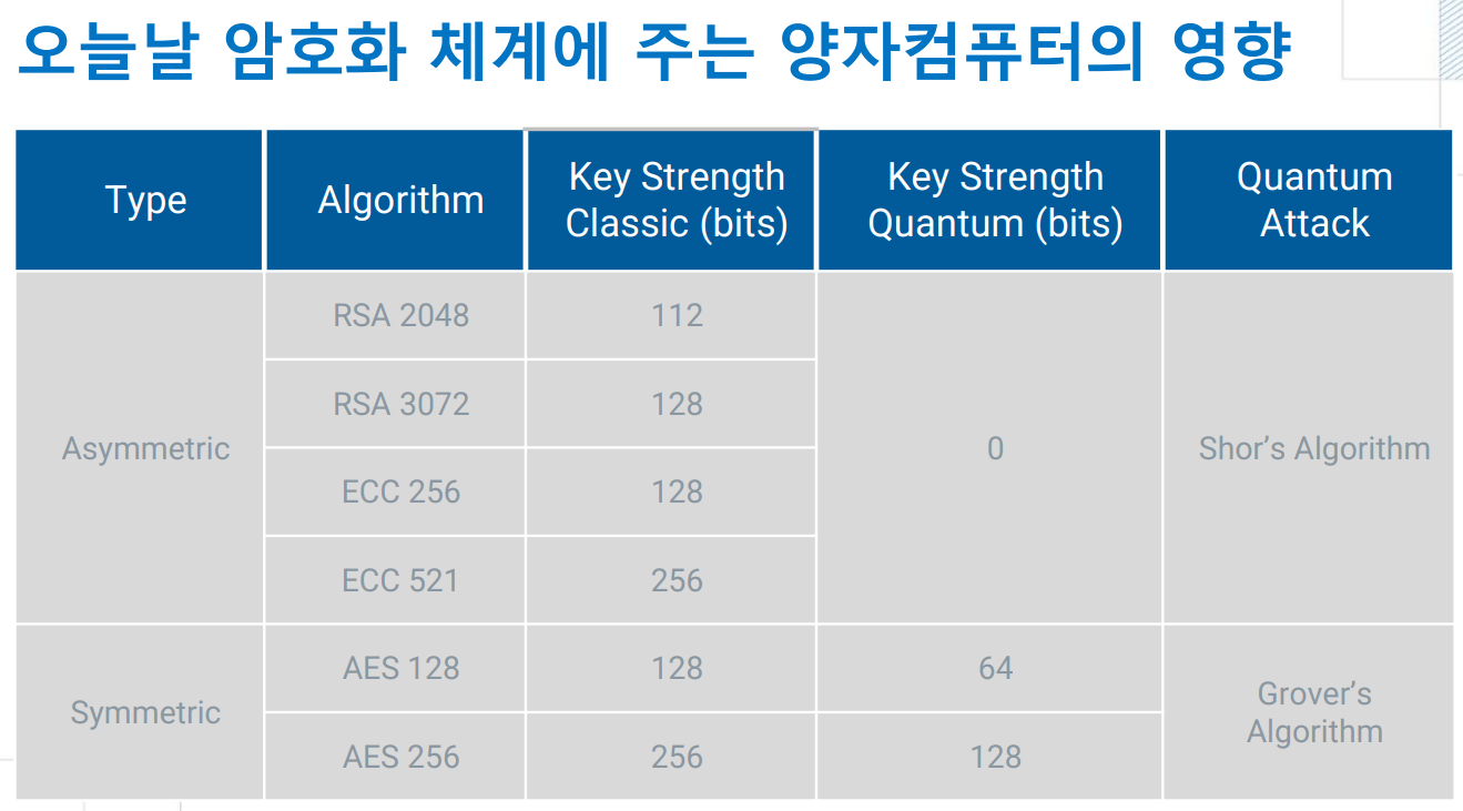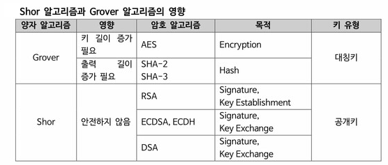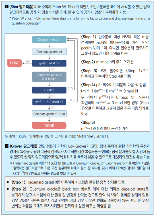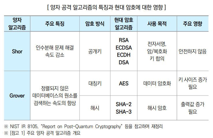 양자 컴퓨터는 기존 고전 컴퓨터보다 빠른 계산 속도를 제공하여 양자 컴퓨팅 환경에서 는 양자 기반 알고리즘인 쇼어(Shor) 알고리즘과 그로버(Grover) 알고리즘이 현대에서 많이 사용되는 공개키 암호 시스템에 큰 변화를 가져오게 된다. 그로버(Grover) 알고리즘 은 정렬되지 않은 데이터베이스의 원소를 검색하는 속도를 향상시켜 대칭키 암호와 해시 함수에 영향을 준다. 쇼어(Shor) 알고리즘은 인수분해 문제 해결 시간을 감소시켜 RSA 암·복호화, RSA 서명, 디피-헬만(Diffie-Hellman) 키 교환 등 여러 공개키 암호 알고리즘 을 사용할 수 없게 만든다.