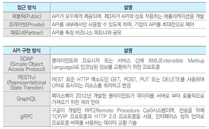 - REST, WebHooks, GraphQL, SOAP, WebSocket, gRPC 등