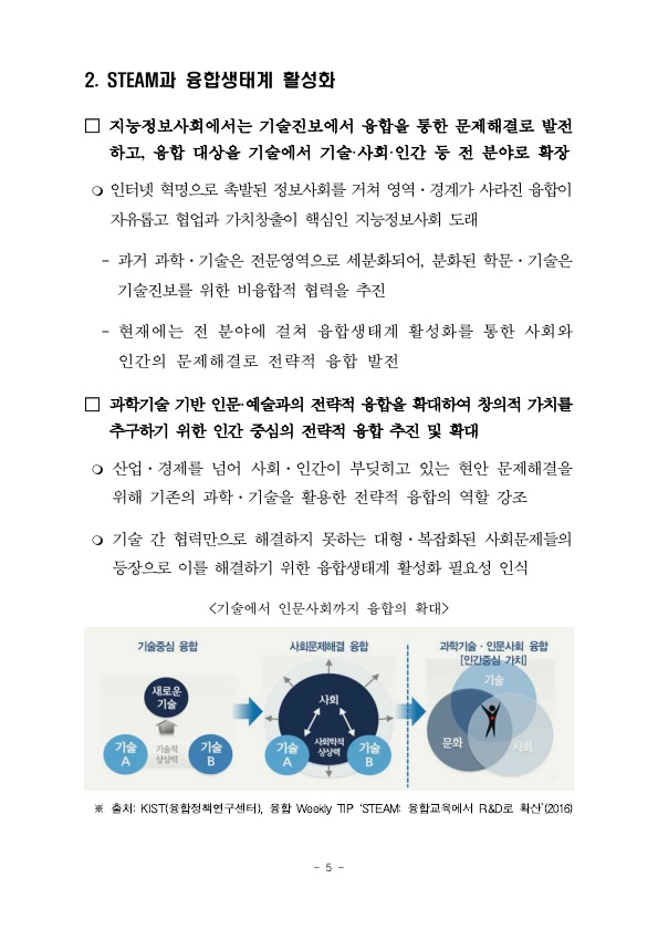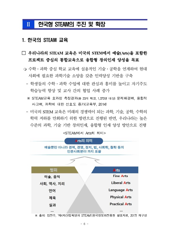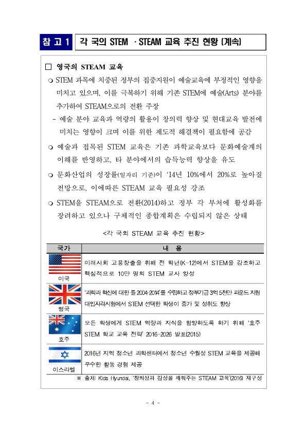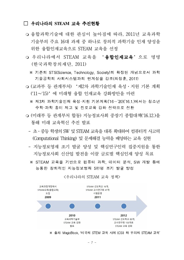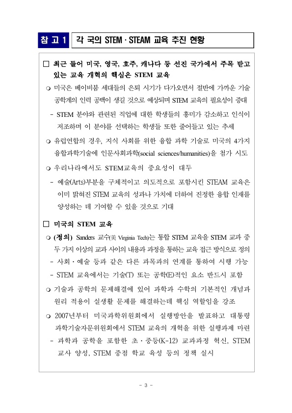 우리나라는 어떨까요? 한 전문가는 AI의 등장으로 상당수 일자리가 저임금·저질 일자리로 변질될 수 있다는 점을 경고하며, “미래 세대가 AI 시대에 대응하려면 인문학과 STEM 교육을 융합할 필요가 있다.”고 지적했습니다. 우리나라에서는 이미 STEM에 Arts(인문·예술)을 통합한 형태인 'STEAM' 교육을 발표, 전국 초·중·고등학교에서 실생활 맥락 속 문제 해결력을 높이고 자기주도 적·협력적 탐구가 가능한 인재를 양성하고자 미래형 융합교육 STEAM 사업을 추진하고 있습니다.
