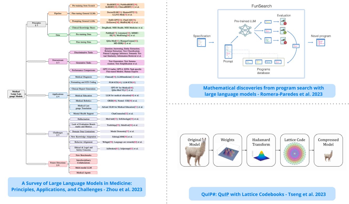 - 의학 분야의 머신러닝에 대한 종합적인 설문조사(300개 이상의 논문 분석)로, 의학 분야의 머신러닝이 직면한 원칙, 적용, 과제에 대한 개요를 포함합니다.A comprehensive survey (analyzing 300+ papers) on llms in medicine; includes an overview of the principles, applications, and challenges faced by llms in medicine.