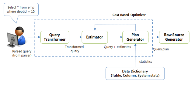 구성요소: 쿼리Transformer(파싱쿼리표준변환), Estimator(비용산정), Plan Generator(쿼리실행계획생성) [Estimator] "선택도","분포도",코스트 계산