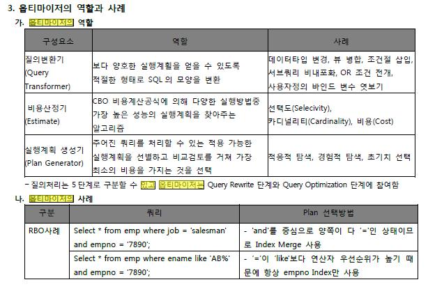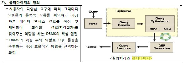 [SQL 최적화과정] Query→Parser→[쿼리Rewrite(질의변환기, 서브쿼리와 뷰 병합수행)→쿼리Optimization(RBO/CBO) ]→QEP생성→쿼리실행→결과
