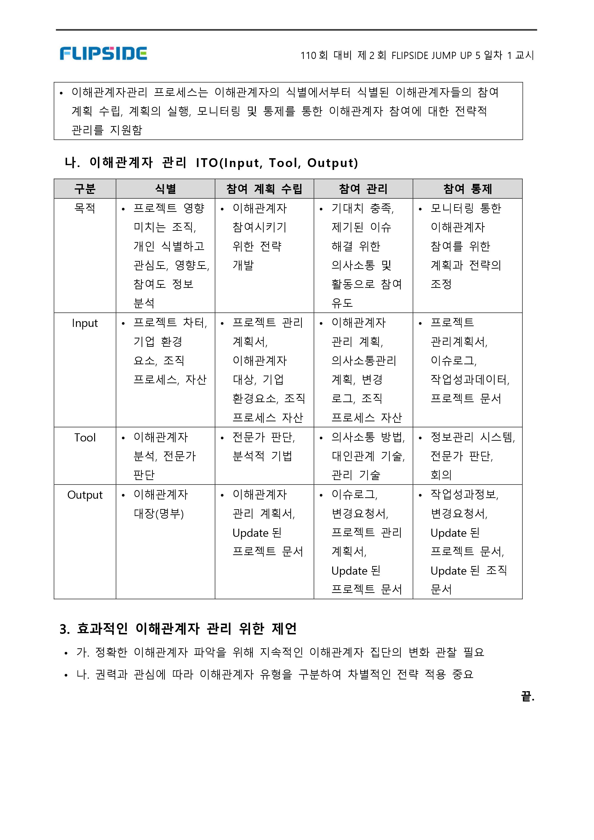 3. 이해관계자 관리 : 정기/비정기 보고, 대면/비대면으로 지속적으로 관리