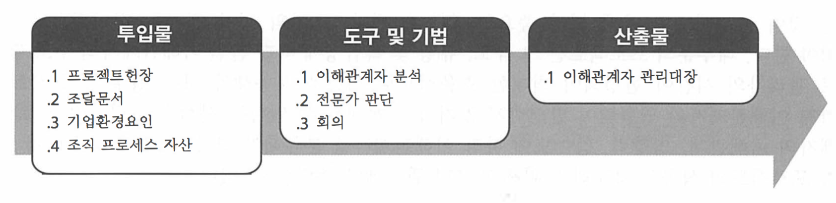 이 해관계자 식별은 프로젝트의 의사결정 ,활동 또는 결과물에 영향을 주거나 영향을 받을 수 있는 개인,집단 또는 조직을 식별하고,이해관계자가 프로젝트의 성공에 미칠 잠재적 영향력,이해관계,참여도,상호 의존관계에 관한 정보를 분석하여 문서화하는 프로세스이다. 이 프로세스의 주요 이점은 프로젝트 관리자가 이해관계자별 또는 이해관계자 집단의 주안점을 식별할수 있게 하는것이다. 이 프로세스의 투입물,도구 및 기법,산출물을 그림 13-2에 나타내었다. 그림 13-3에서 프로세스의 데이터 흐름도를 보여준다.