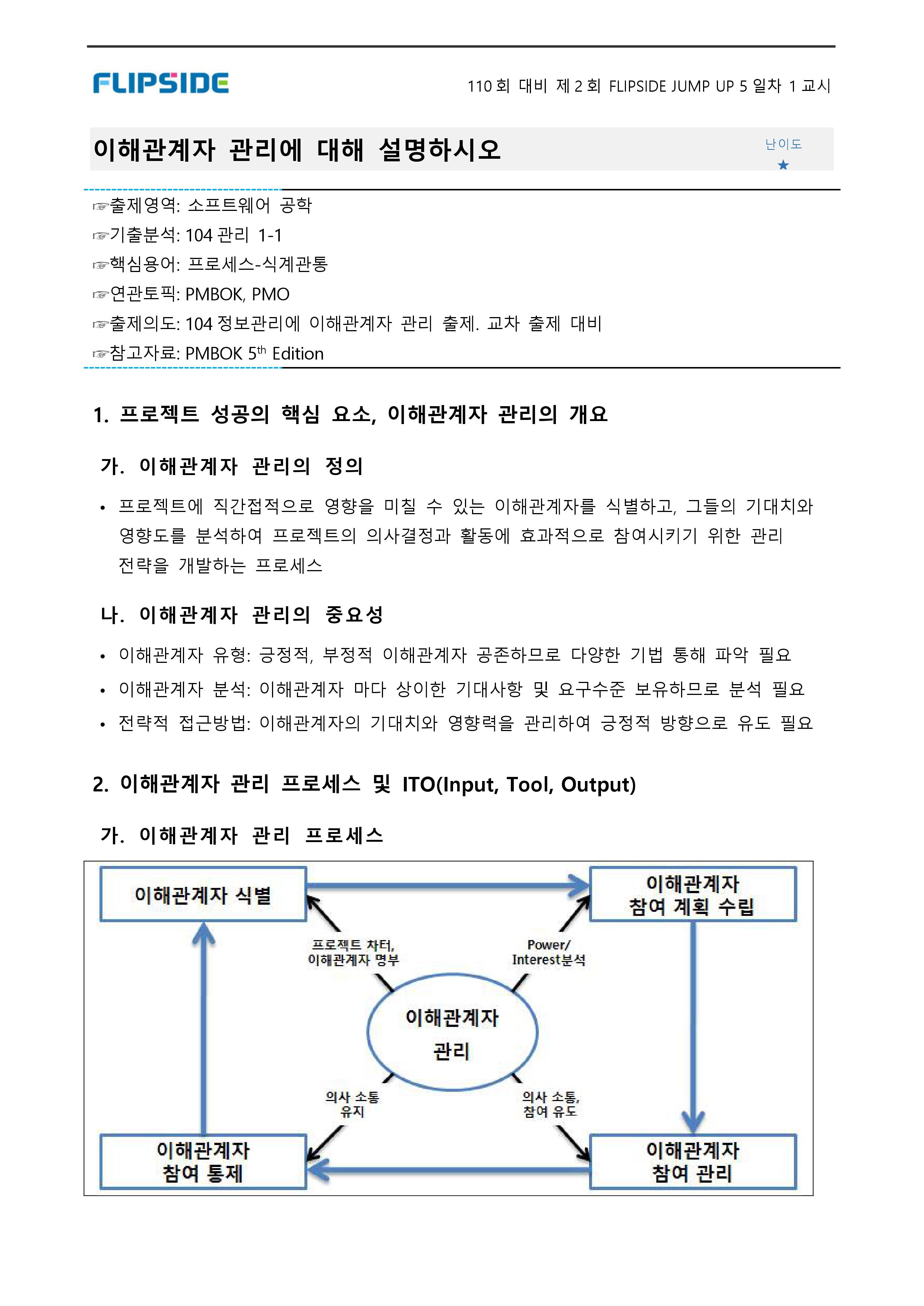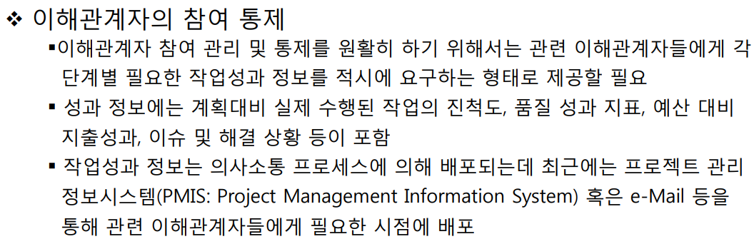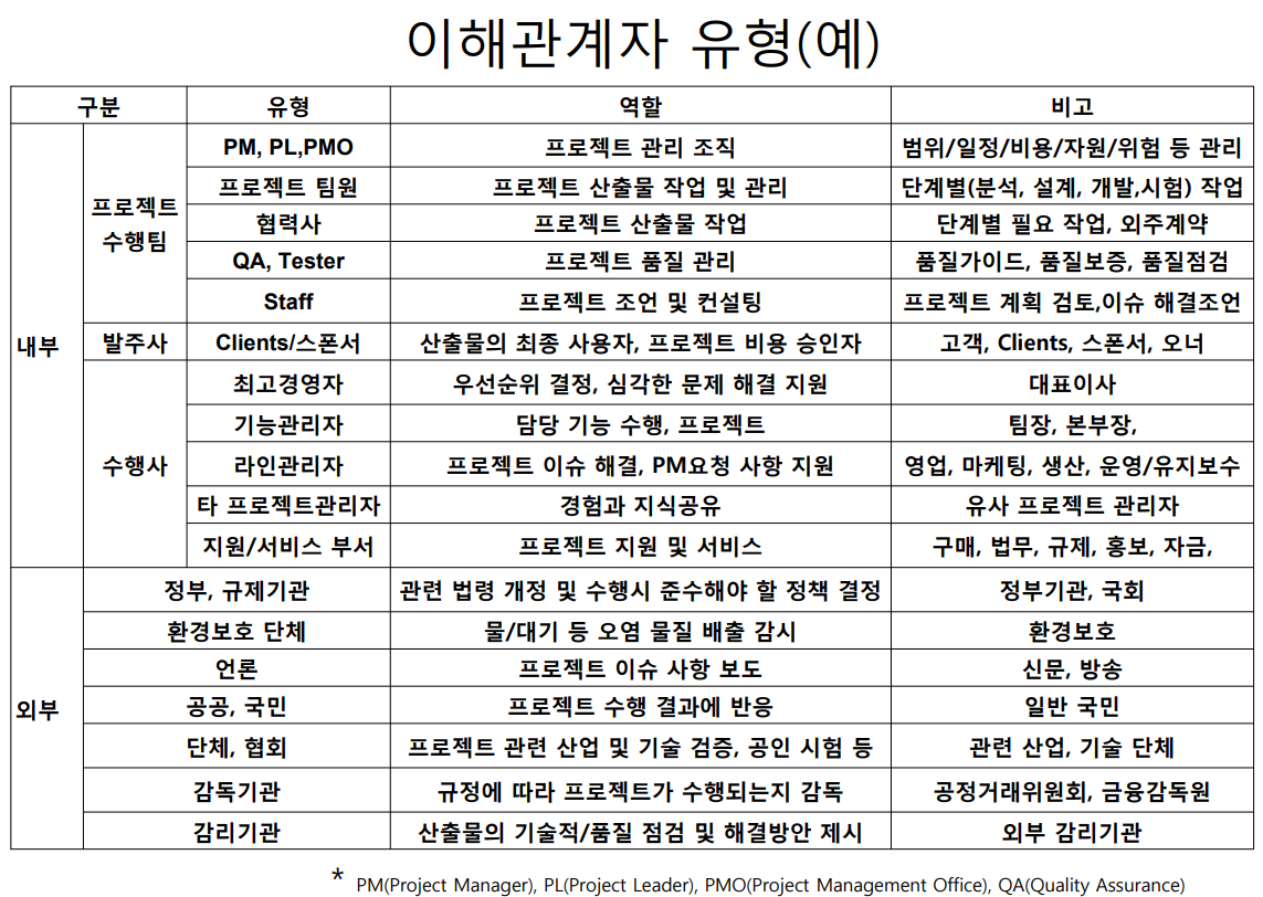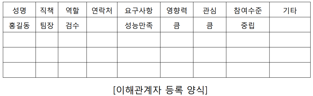 1. 이해관계자 식별 : RFP문서,킥오프미팅으로부터, 담당자의 전화번호,이름,직책,이메일주소를 수집하는 활동 .--> 이해관계자 대장을 생성