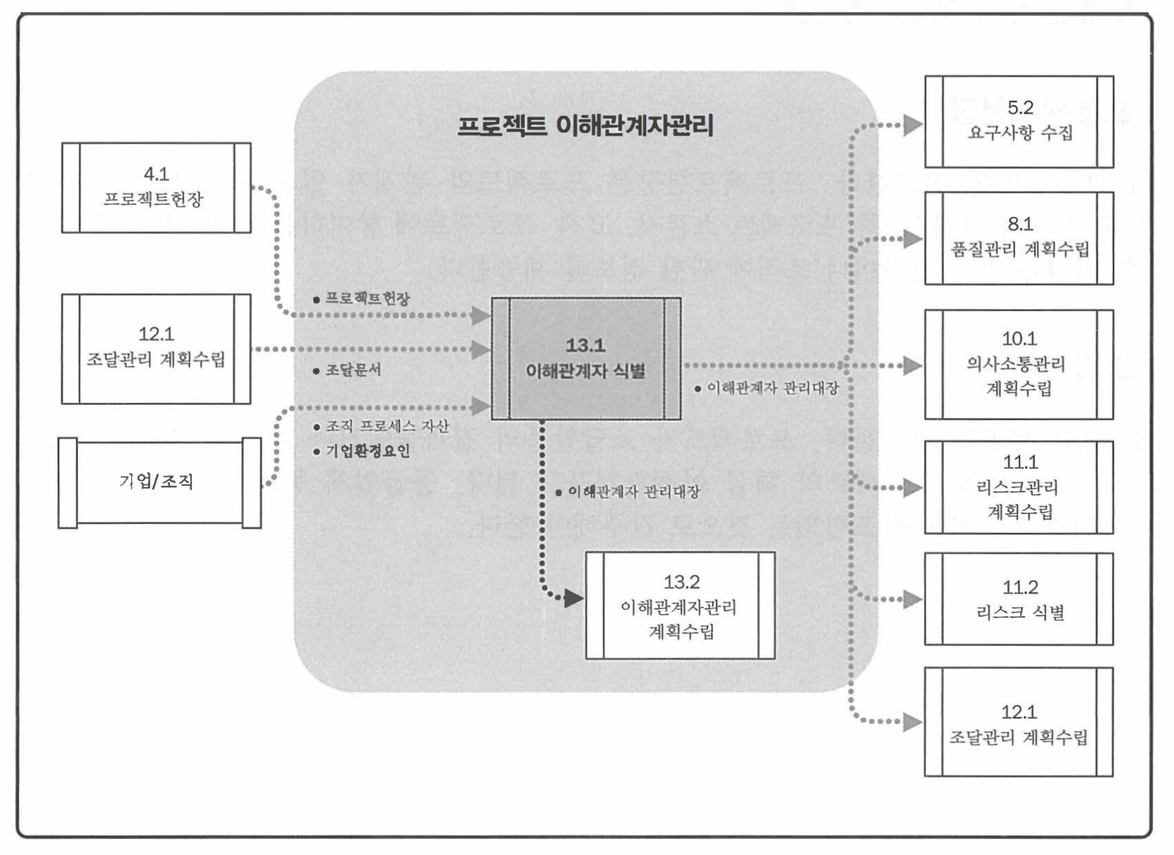 받을수 있는,또는 스스로 영향을 받는다고 여기는 개인,집단 또는 조직을 가리킨다. 고객,스폰서,수행조직,일반대중 등과 같이 프로젝트에 적극적으로 참여하거나 프로젝트의 성과 및 완료 결과물에 따라 이해사항이 긍정적 또는 부정적 영향을 받을 수 있는 개인과 조직들이 프로젝트 이해관계자에 포함된다. 이해관계자는 프로젝트와 인도물에도 영향을 줄 수 있다. 조직 내부 여러 직급의 다양한 권한 보유자 뿐 아니라 프로젝트 수행조직 외부의 관련자도 이해관계자에 포함될 수 있다. 13.1.2.1절에서 다양한 유형의 프로젝트 이해관계자를 식별하고 있다.