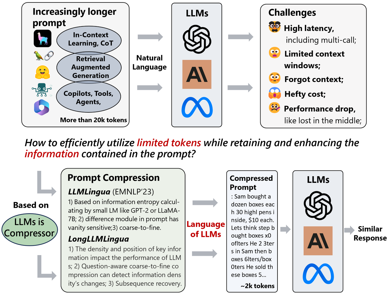 - LLM의 추론 속도를 높이고 주요 정보에 대한 LLM의 인식을 향상시키기 위해 프롬프트와 KV-Cache를 압축