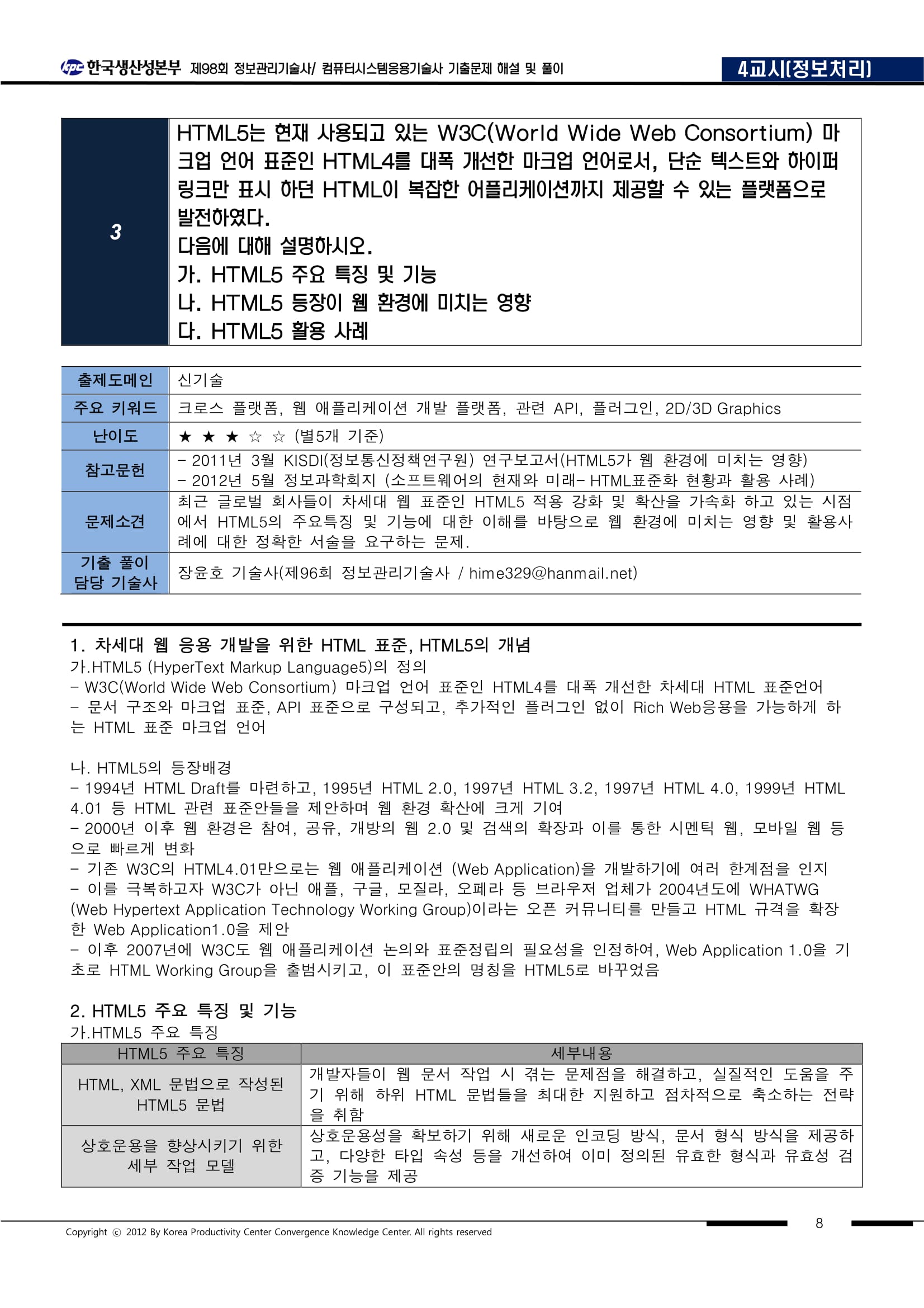 W3C(World Wide Web Consortium)을 중심으로 기존의 HTML 표준의 한계를 극복하기 위해 추가적인 플러그인 없이 리치 웹 응용을 가능하게 하는 차세대 HTML 표준