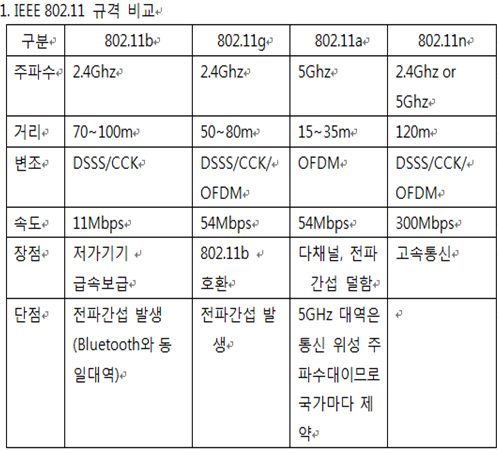 1. WiFi : IEEE 802.11x 표준을 기반으로 기존 LAN환경을 바탕으로 무선주파수를 사용하여 일정공간 내에서 네트워크에 접속할 수 있는 기술