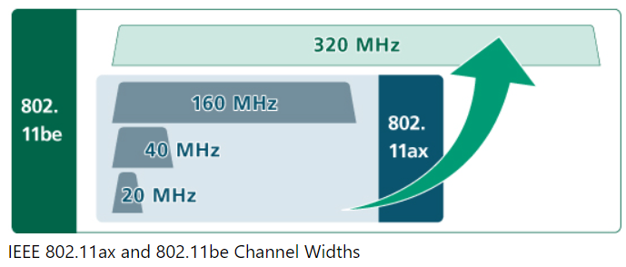 - 320 MHz 채널 : 6GHz 대역을 Wi-Fi에 사용할 수 있는 국가에서 사용 가능, 초광각 채널은 오늘날 가장 넓은 채널 크기의 두 배로 멀티기가비트 장치 속도와 높은 처리량을 촉진함