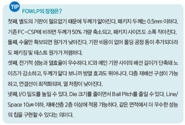 FOWLP는 반도체 칩 외부에 입출력단자(I/O)를 배치시키는 기술로, 기존 PCB(인쇄회로기판)가 아닌 실리콘 웨이퍼에 칩을 집적한다.