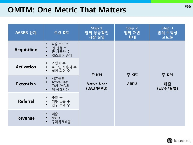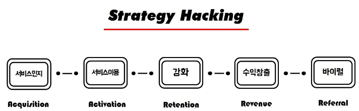 [단계] 1)유입(사이트 유입 가입자수 최대) 2)습득(사용자 빠른 제품이해) 3)활성화(제품핵심가치전달) 4)보유(지속사용자, 5)소개(새로운 사용자유입)