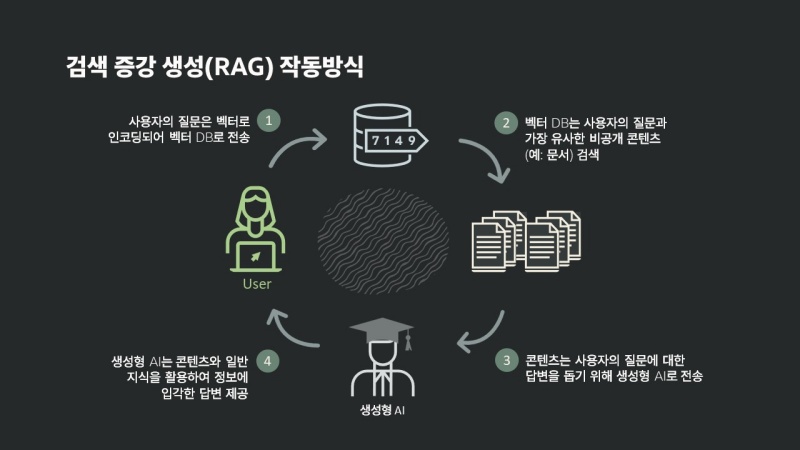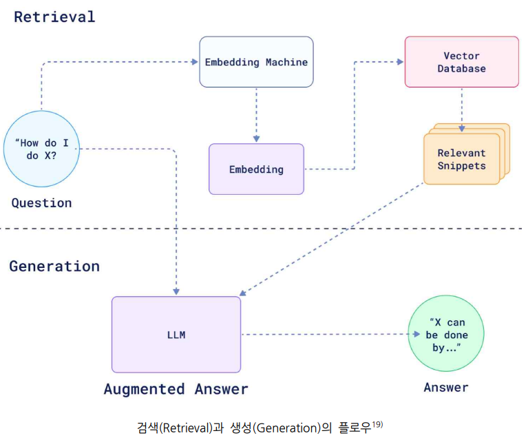 - 대규모 데이터 세트 또는 지식 기반을 검색하도록 설계된 검색 모델에 해당 정보를 가져와 읽을 수 있는 텍스트 응답을 생성하는 대규모 언어 모델(LLM)과 같은 생성 모델을 결합