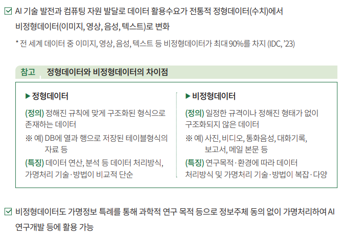 | 배경 | - (비정형데이터 수요 확대) 인공지능 기술 등의 발달로 전세계 활용 데이터 중 이미지, 영상, 음성, 텍스트 등 비정형데이터가 최대 90%를 차지(IDC, '23)- (기존 가명정보 처리 가이드라인 한계) 기존 가이드라인은 정형데이터에 대한 처리 기준만 제시하여비정형데이터에 대해서는 적합한 가명처리 방법이나 수준 파악의 어려움 존재 |