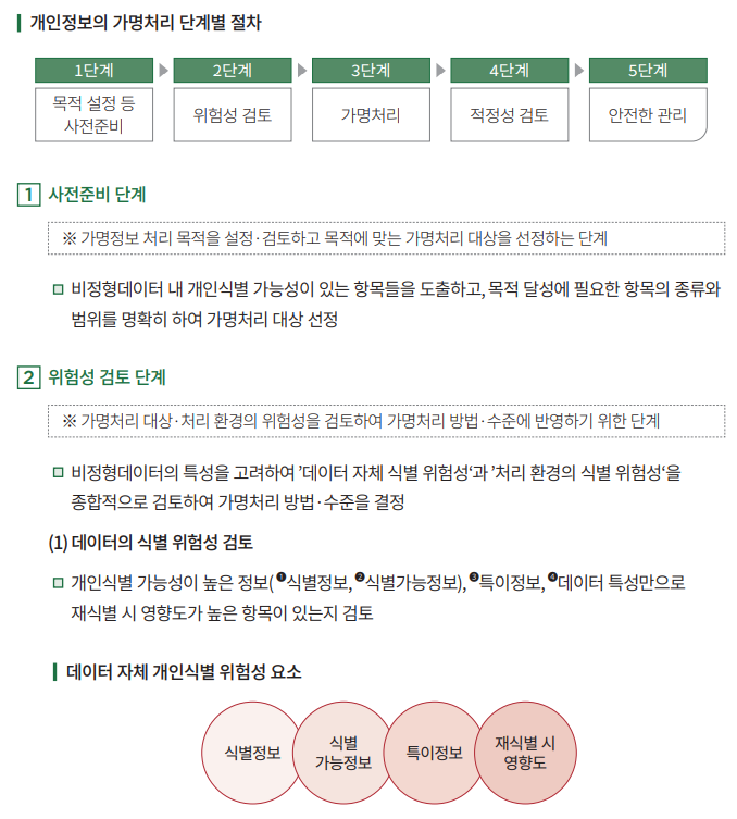 | 2. 위험성 검토 단계 | - 비정형데이터의 특성을 고려하여 '데이터 자체 식별 위험성'과 '처리 환경의 식별 위험성'을 종합적으로 검토하여 가명처리 방법/수준을 결정 |