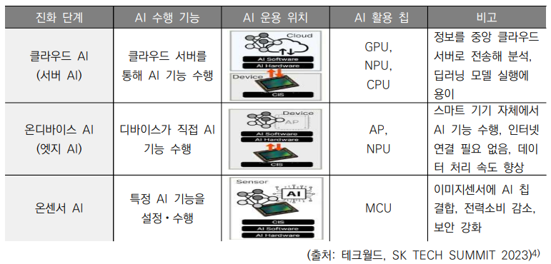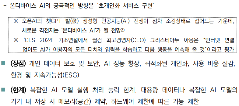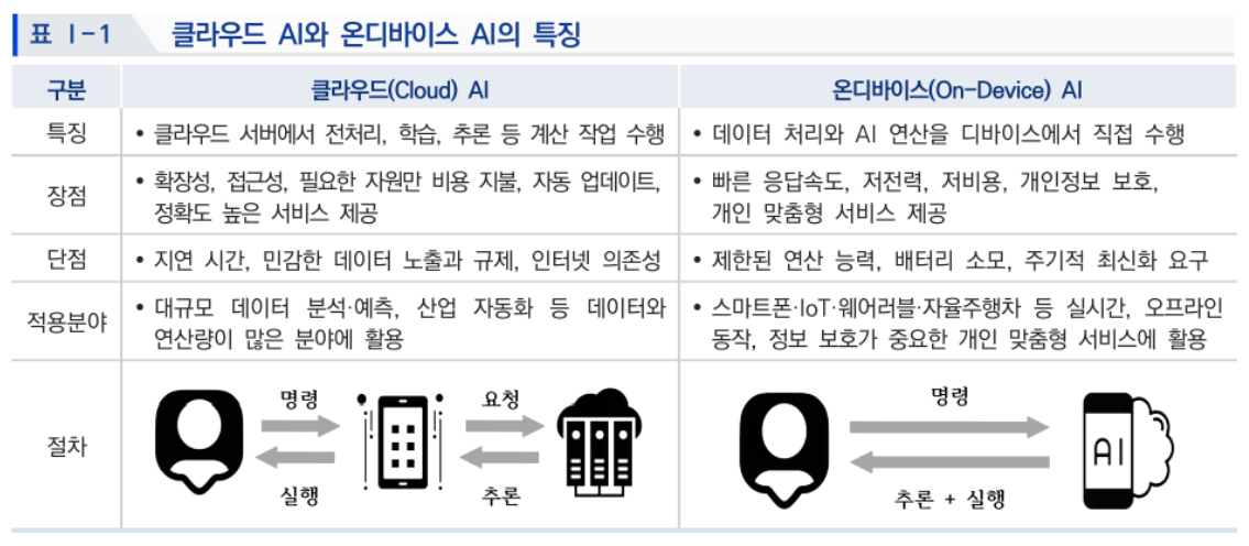 I. 온디바이스 AI 개념O (정의) 클라우드로 데이터를 전송하는 방식에서 벗어나 인터넷 연결 없이, 기기 내부에서 자체적으로 AI 연산을 처리하는 방식O (특징) 빠른 서비스 제공, 강화된 정보