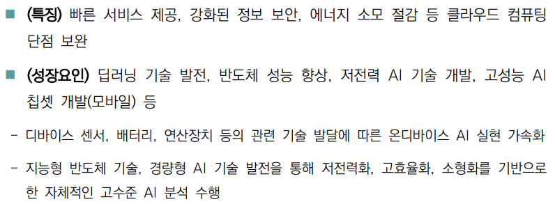 - 클라우드로 데이터를 전송하는 방식에서 벗어나 인터넷 연결 없이 기기 , 내부에서 자체적으로 연산을 처리하는 방식