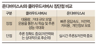 클라우드로 데이터를 전송하는 대신, 이용자가 소유한 기기 안에서 자체적으로 AI 연산을 처리하는 방식이다. 인터넷 연결 없이 활용할 수 있고 속도가 빠르며, 개인정보 보호, 비용 측면에서 유리하다. 이외에 개인의 사진이나 데이터와 접목할 수 있는 장점이 있지만 데이터의 수가 적어 산출되는 결과물의 완성도는 부족할 수 있다.