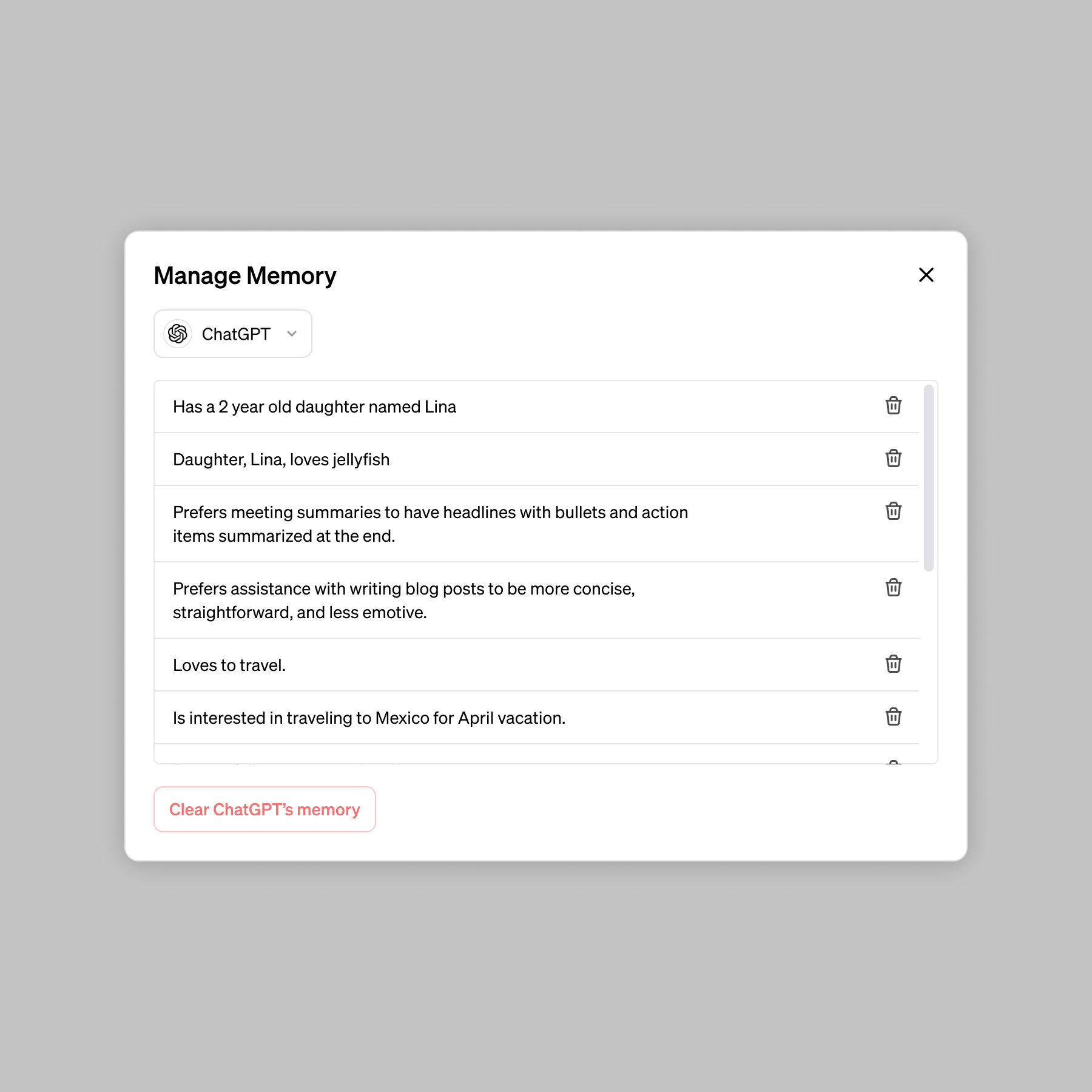 We’re testing the ability for ChatGPT to remember things you discuss to make future chats more helpful. You’re in control of ChatGPT’s memory.