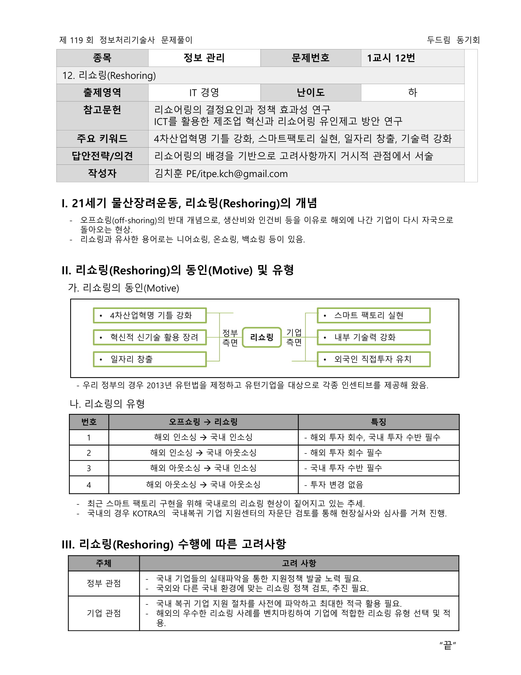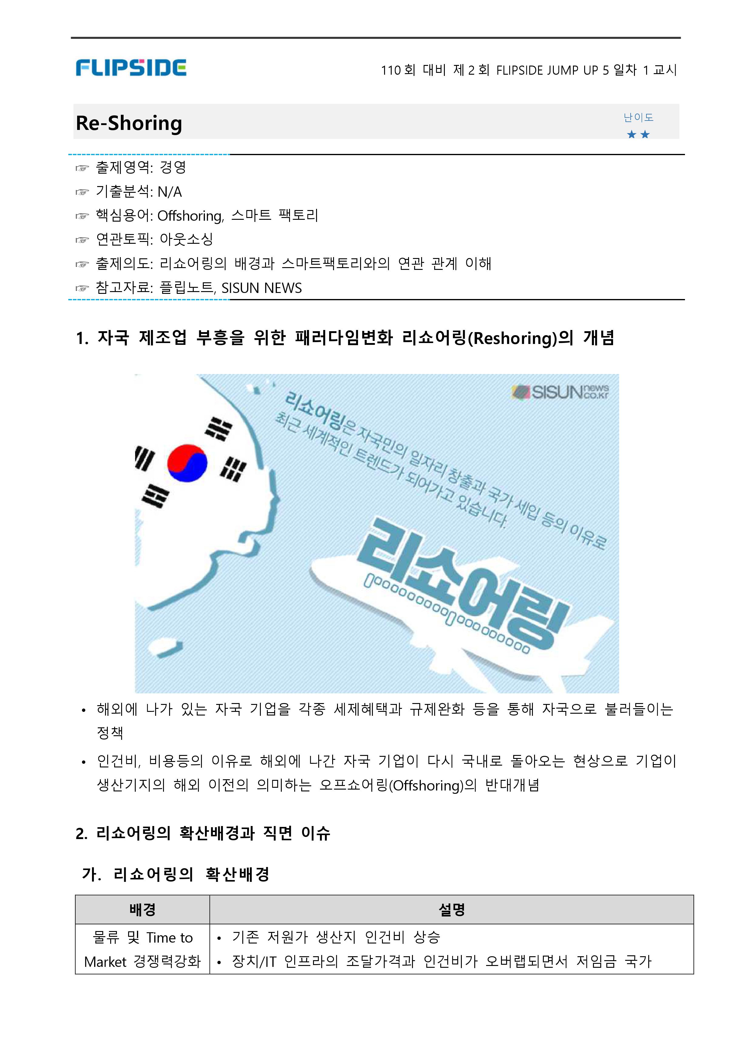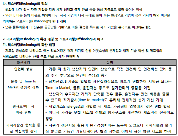 - 인건비, 비용 등의 이유로 해외에 나간 자국 기업이 다시 국내로 돌아 오는 현상으로 기업이 생산 기지의 해외 이전을