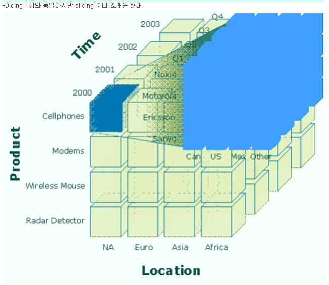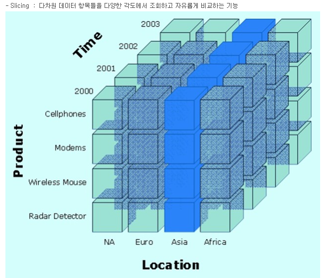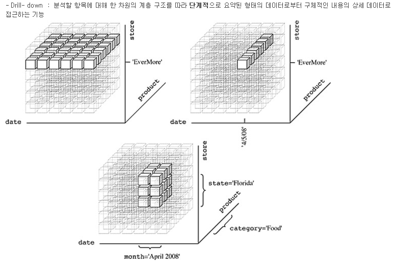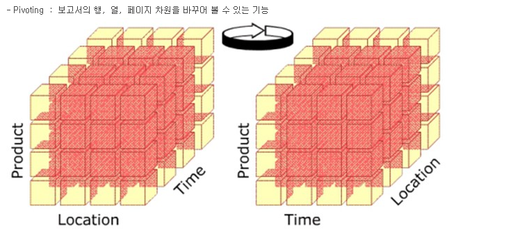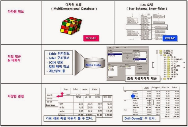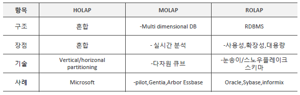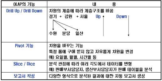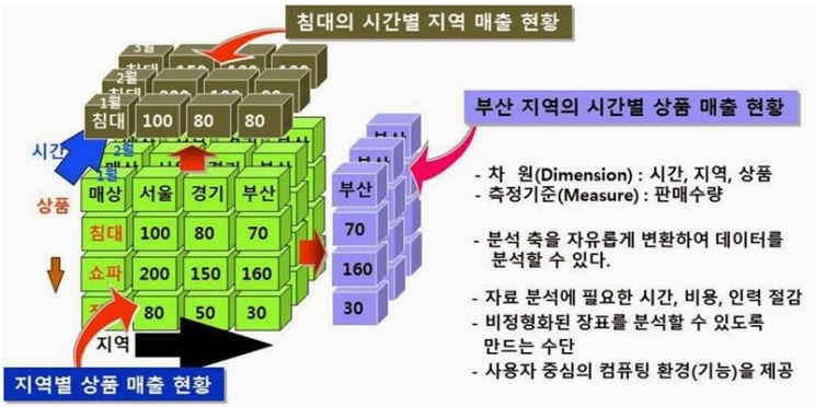- 다차원 데이터의 저장기능 프로세싱에 다차원DBMS가 사용되어 여러 각도에서 정보 분석