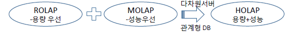 - 요약된 데이터와 관계식에 의해 새로 계산된 데이터는 다차원 데이터 베이스에 저장하고 상세 데이터는 관계형 데이터 베이스에 저장
