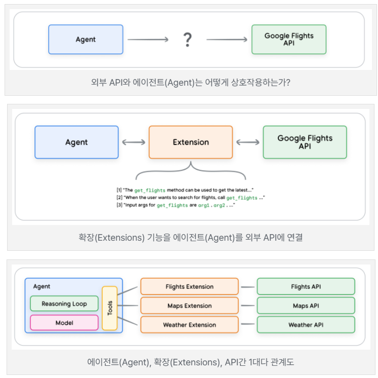 - 에이전트(Agent)가 외부 데이터 및 서비스와 상호작용할 수 있도록 지원하는 요소입니다. API 호출, 데이터베이스 검색, 실시간 정보 접근 등 다양한 형태로 존재하며, 에이전트(Agent)가 실제 세계와 연결되는 핵심 통로 역할을 합니다.