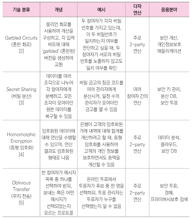 (개념) 여러 참여자들이 자신의 데이터를 공개하지 않고도 공동으로 계산을 수행할 수 있게 하는 암호학적 기법