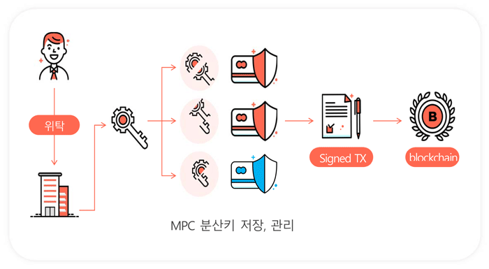 그 중 하나로 여러 개의 개인키로 여러 개의 서명을 통해 디지털 자산을 관리하는 다중키 다중서명(Multi-Sig) 기술이 존재한다. 하지만 해당 기술의 보안성 및 확장성의 한계점으로 인해 여러 개의 분할키로 하나의 서명을 통해 디지털 자산을 관리하는 다자간계산(MPC/Multi-Party Computation)이 주로 디지털 자산의 안전한 보관을 위해 수탁사업자에 의해 사용되고 있다.