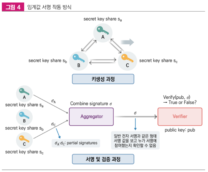 2) 임계값 서명 (Threshold Signature) : 여러 참가자가 문서나 메시지에 대한 디지털 서명을 공동으로 생성할 수 있게 해주는 암호학적 기술