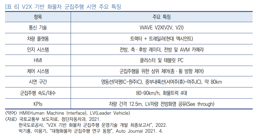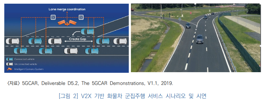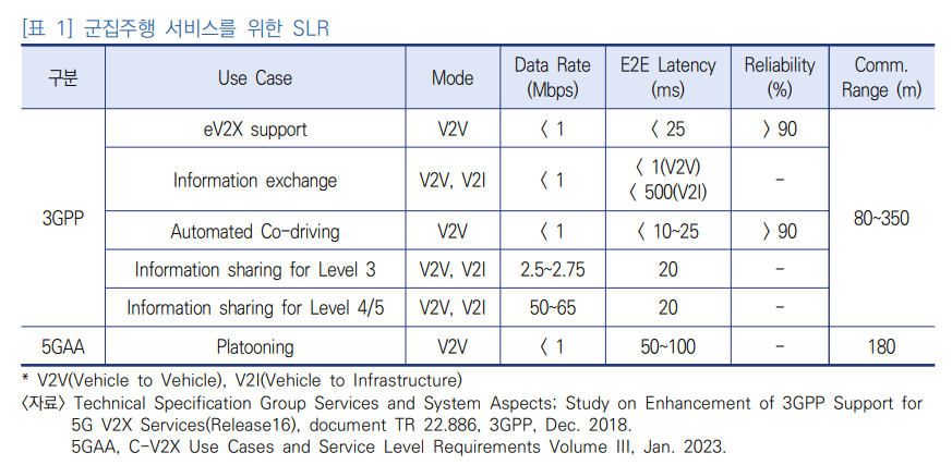 차량 간 혹은 차량과 인프라 간 통신을 통한 군집합류, 이탈, 제어 등의 메시지를 공유하고 전달한다. 표준단체에서 제시하는 유즈케이스 및 서비스 요구사항(Serivce Level Requirements: SLR) 은 [표 1]과 같다.