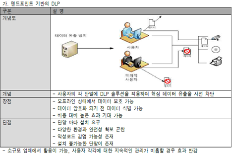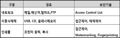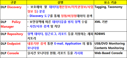 * DLP : 기업내부의 민감한 데이터 및 지적재산/사업정보 등 핵심 데이터의 외부유출을 방지 하기 위한 솔루션