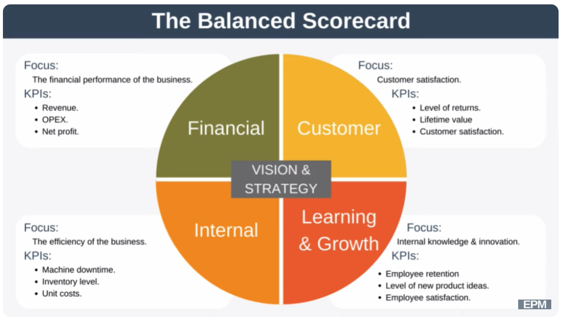 [개념] 재무적 관점과 고객, 내부프로세스, 학습과 성장 측면의 3가지 비재무적 관점을 측정 가능한 핵심 성과지표(KPI)로 전환하여 관리하는 성과관리기법